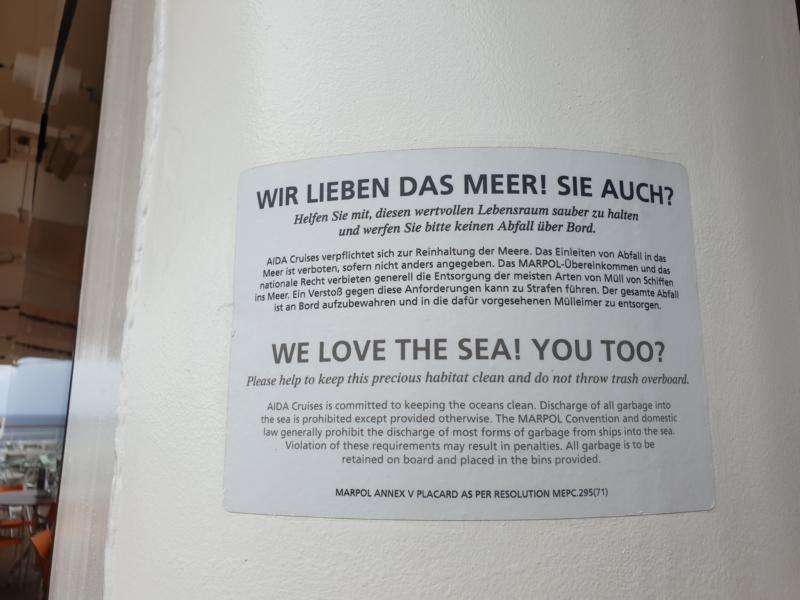 Bei der Gelegenheit fällt mir ein, ich habe einen Aufkleber an Bord gesehen, der mir vorher noch aufgefallen war. Finde ich eine gute Sache, denn wie schnell ist mal was über Bord „gefallen“.