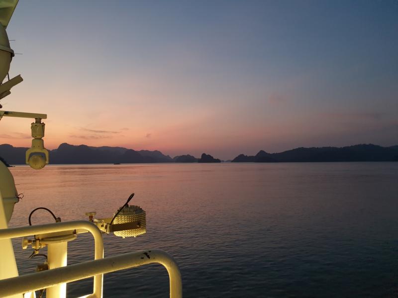 Der frühe Start eines Ausflugs hat für mich einen tollen Nebeneffekt: vor dem Frühstück den Sonnenaufgang fotografieren. Und es ist sogar Land in Sicht. Der Küstenstreifen und die vielen kleinen Inseln im roten Morgenlicht sind einen Blick wert. Wir sind heute zum vierten Mal auf Langkawi unterwegs und wir freuen uns auf unseren privat gebuchten Ausflug und das Wiedersehen mit den malaiischen Freunden.