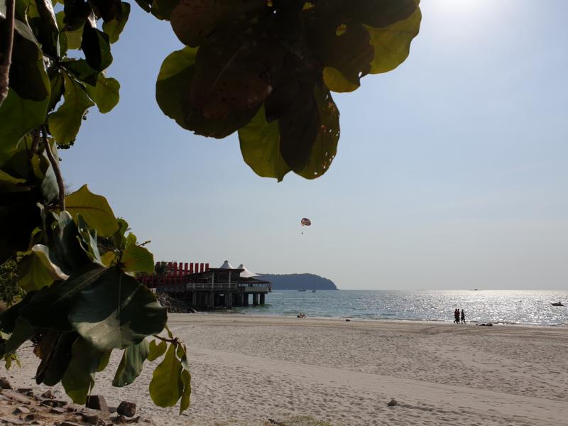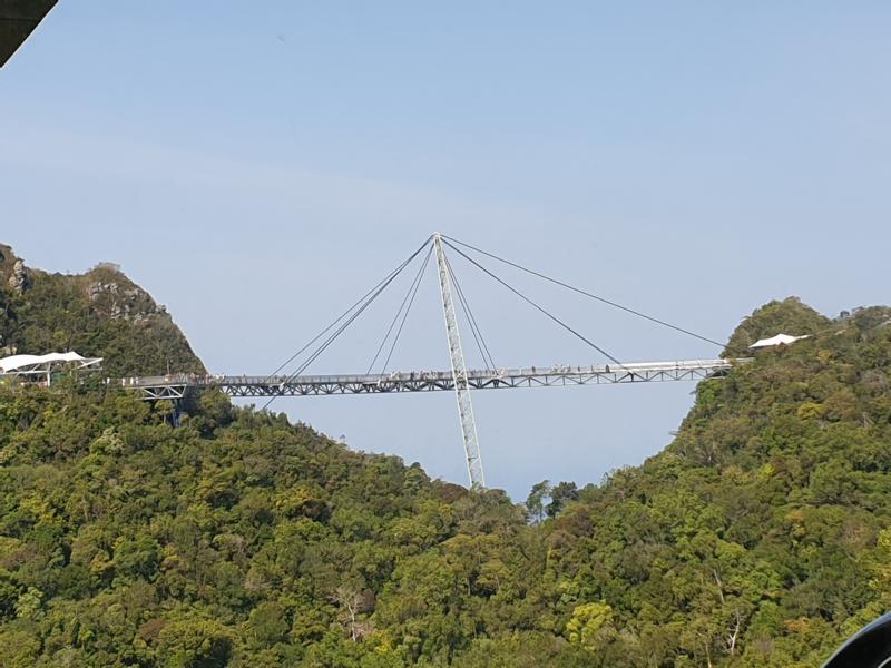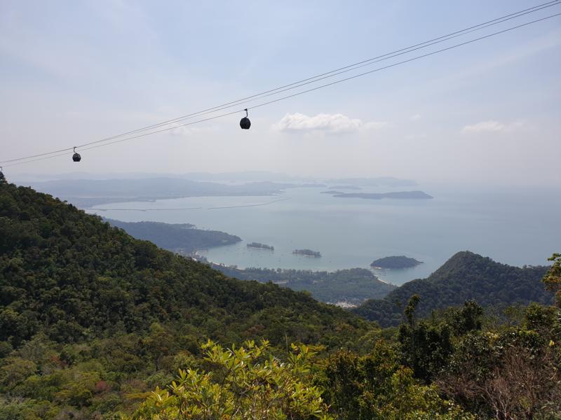 Auf der Fahrt abwärts sitzen wir mit ein paar jungen Frauen in der Gondel, die fasziniert sind, wie so langsam die Küste immer näher auf uns zu kommt. Unten angekommen, bummeln wir noch durch das Oriental Village mit den kleinen Souvenirshops und laufen über die wackelnde Seilbrücke zum Parkplatz. Alle sind da, niemand irrt noch oben herum und los geht die Fahrt zum Pantai Chang Beach. An einem Beach waren wir bisher auch noch nicht gewesen. Das Badezeug haben wir nicht mitgenommen, wir wollen ein wenig am Strand laufen und was kleines Essen und trinken und dann geht es ja wieder zurück zur Bella.