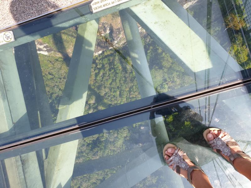 Was für eine Menschenansammlung! Ist ja nicht verwunderlich. Die 125 Meter lange Schrägseilbrücke hängt sozusagen an einer einzigen Stütze. Wir laufen vor, zu einem der beiden dreieckigen Plattformen und genießen die herrliche Aussicht. Besonders lustig geht es auf der 1,80 m breiten Brücke an den Stellen zu, wo dicke Glasplatten montiert sind. Schaut man durch sie durch, erblickt man die Bäume tief unter der Brücke. Mutige vor für ein Erinnerungsfoto. Ich bin kein Frosch und schon stehe ich drauf.