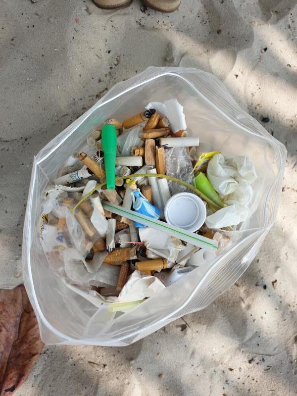 Aber eins muss ich fairerweise sagen, es sind Leute an der Wasserlinie unterwegs, die die Quallen einsammeln und angeschwemmten Müll zusammenkehren und mitnehmen. Alle gut verhüllt, damit sie ja nicht braun werden. Das, was ich gefunden habe, sind Sachen, die die Besucher im Sand zurückgelassen haben.