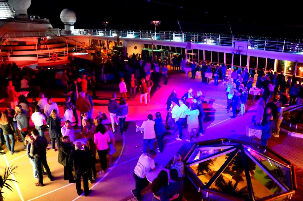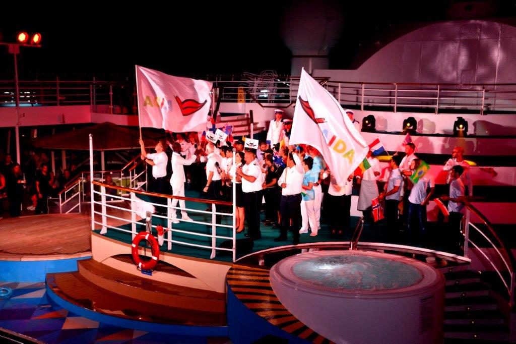 Prima und anders als bisher war der Auftritt der Crewabordnung. Sie zogen langsam über beide Sonnendecks auf Deck 11 zur Außenbühne, jeweils geführt von einem AIDA-Fahnenträger. Allen war der lauteste Beifall an diesem Abend sicher.