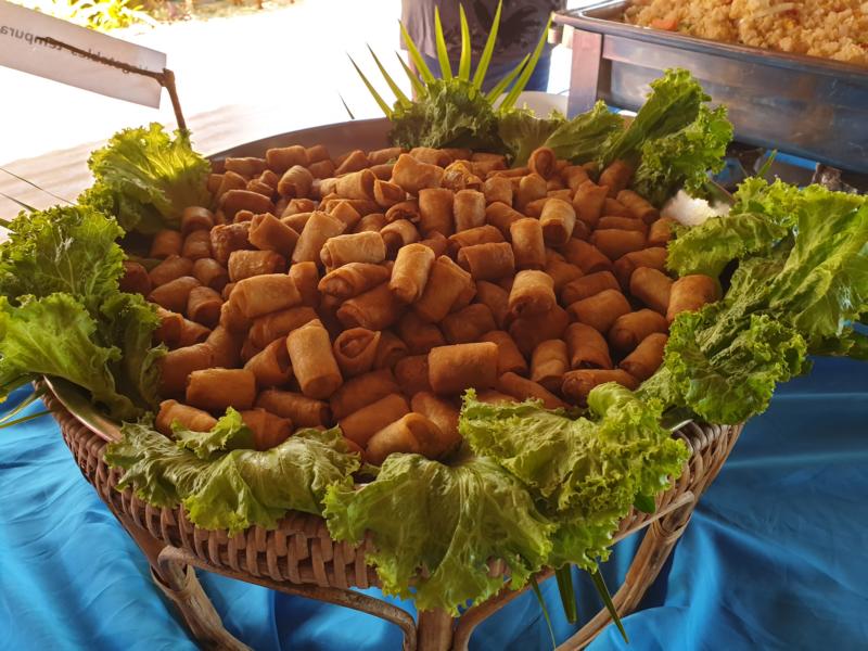 Tische und Stühle stehen im Schatten, der leichte Wind kann hier durch wehen und es duftet schon sehr verführerisch. An verschiedenen Stationen können wir uns bedienen und ein Frau bereitet in Windeseile ein schmackhaftes Pat Thai zu. Genau mein Geschmack. Ja, und es gibt eine riesige Schale mit knusprigen Frühlingsrollen - da lange ich dann mal zu.