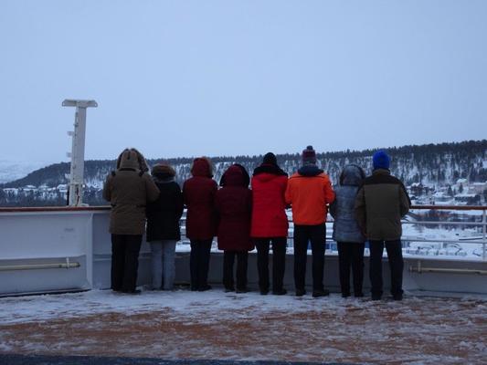 Was gab es rund um unser Schiff? Gekrönte Wellen. Schaumkronen. Bis zu 3 ½ m hoch. Also weiter ein leichtes Schaukeln. 8° Luft, 8° Wasser. Wir blieben an der Luft. Um uns herum das für diese Meeresumgebung und Jahreszeit typische Wetter. Alles grau. Später kam Nieselregen dazu. Es störte uns während des Frühstücks nicht. Hhm, lecker … Endlich wieder das ausgezeichnete Vollkornbrot, knuspriger Bacon, Spiegeleier, Frikadellen, Räucherlachs, … Gemeinsam mit Floppys. Später stießen Kreuzfahrergerds dazu. Ein langes Frühstück, dem ein kurzer Spaziergang auf der von Wind und Nieselregen geschützten Seite auf Deck 6 folgte.