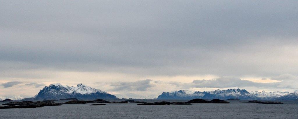 Zunächst bis zur Abzweigung zu unserem Ziel – zur Insel Sandhornøya. Warum ausgerechnet auf diese 103 m² große, nicht gerade stark bevölkerte Felseninsel? Dorthin, wo der Hund begraben war? Wenn überhaupt nur kleine Ortschaften – eher Haufenbildungen von Häusern. Im Netz war so gut wie nichts über Sandhornøya zu finden. Außer dass dort Ferienunterkünfte angeboten wurden und dass es ein Eldorado für Angler war. Aber nicht gerade im Winter … Und zufälligerweise hatten wir die Angeln nicht an Bord … Also warum wollten wir nach Sandhornøya? Ganz einfach: Wir wollten noch mehr Winter und die norwegische Natur. Letzteres fanden wir, aber den Winter konnten wir während der Fahrt nur hoch oben auf den Bergen erkennen. Wie hier, an der Bucht Kjøpstadosen. Dort, wo wir die sehr gut ausgebaute Touristenstraße verließen, um über Nebenstraßen auf die Insel Sandhornøya zu fahren.
