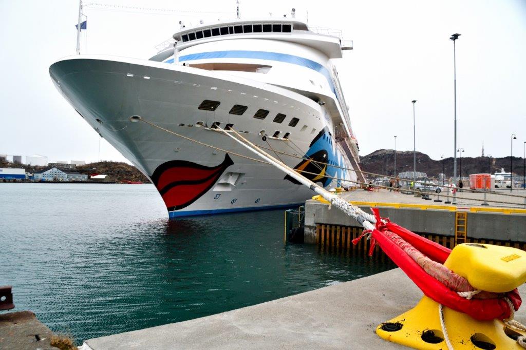 Nun noch schnell bis zum Ende der Mole, an der Fischer- und Sportboote sowie auch historische, liebevoll renovierte Boote ihr Winterdasein fristeten. Dann aber zurück zum Schiff. Dieses Mal allerdings durch die Fußgängerzone, in der wir dem Denkmal für König Haakon VII unsere Aufwartung machten. Den gibt´s übrigens in vielen norwegischen Städten. Gut gefiel uns auch das allen in der Gegend um Bodø herumfliegenden Seeadlern gewidmete Denkmal. Das war´s für uns dann von dieser Stadt, denn wir wollten pünktlich zum „Alle Personen an Bord“ auf unserer AIDAcara sein. Klar, dass wir es schafften und uns anschließend mit dem Rest der Bande zum Auslaufen trafen. Es (nicht uns – das kam später) dämmerte, als sich das Schiff vom Kai löste, am Nyholmen Fort entlangschlich und anschließend vorbei am Sport- und Flughafen das offene Nordmeer anvisierte. Für uns war es Zeit, uns in den Innereien der AIDAcara aufzuwärmen und auf das Abendessen vorzubereiten.