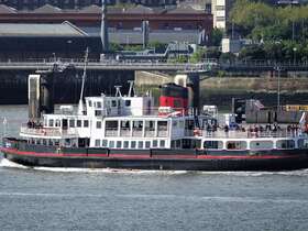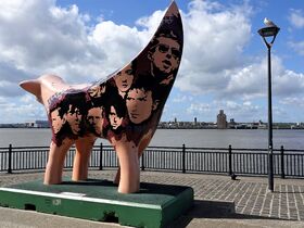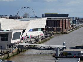 Wenn wir zu Flussseite schauen, sehen wir die weltbekannte und besungene Fähre über den Mersey River, der auch Namensgeber für den Sound der Stadt war: den Mersey-Beat, der sich aus den hier schon vertretenen Musikstile wie Rock ‚n‘ Roll, Blues, Jazz und Folk entwickelte und dessen Wiege im 1957 gegründeten „Cavern Club“ stand.