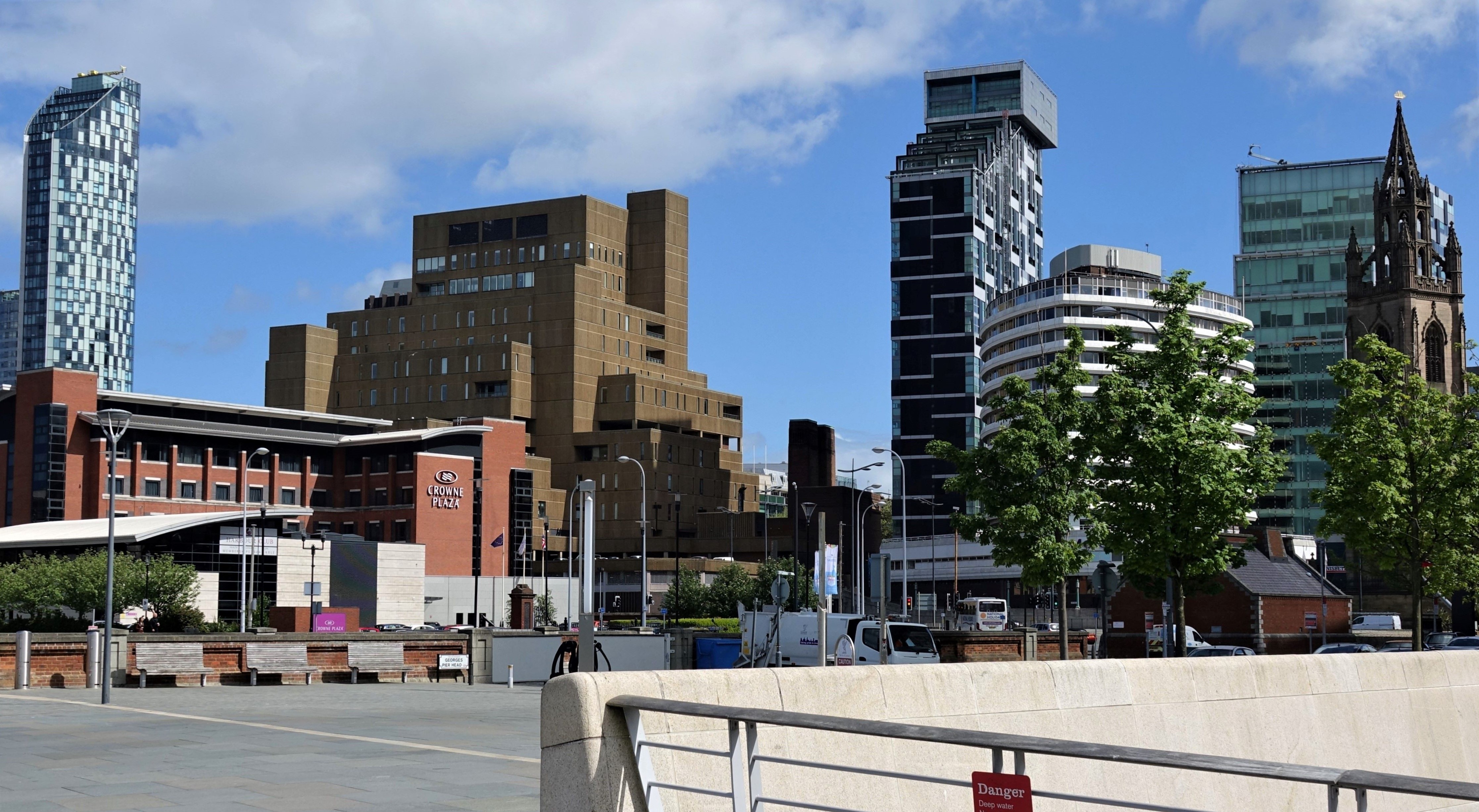 Zur Skyline gehören auch ein paar moderne Bauten, wobei ich manchmal nicht so genau weiß, was uns der Architekt sagen will. In der 34. Etage des West Towers (auf dem Foto ganz links) befindet sich 300 Fuß über dem Boden das Restaurant „Panaramic 34“. Bei gutem Wetter hat man hier neben erlesener cuisine auch einen Blick bis Nordwales.