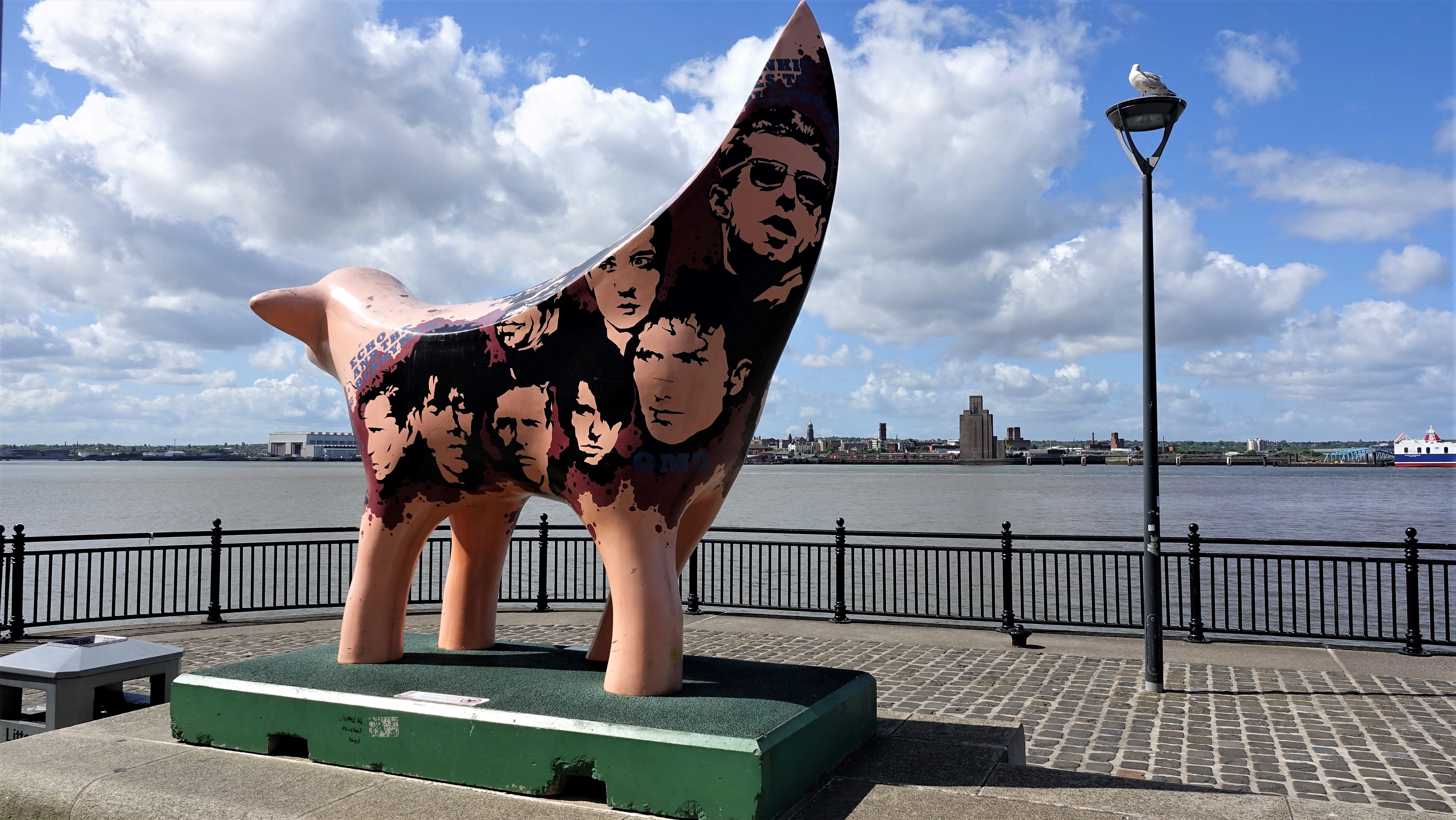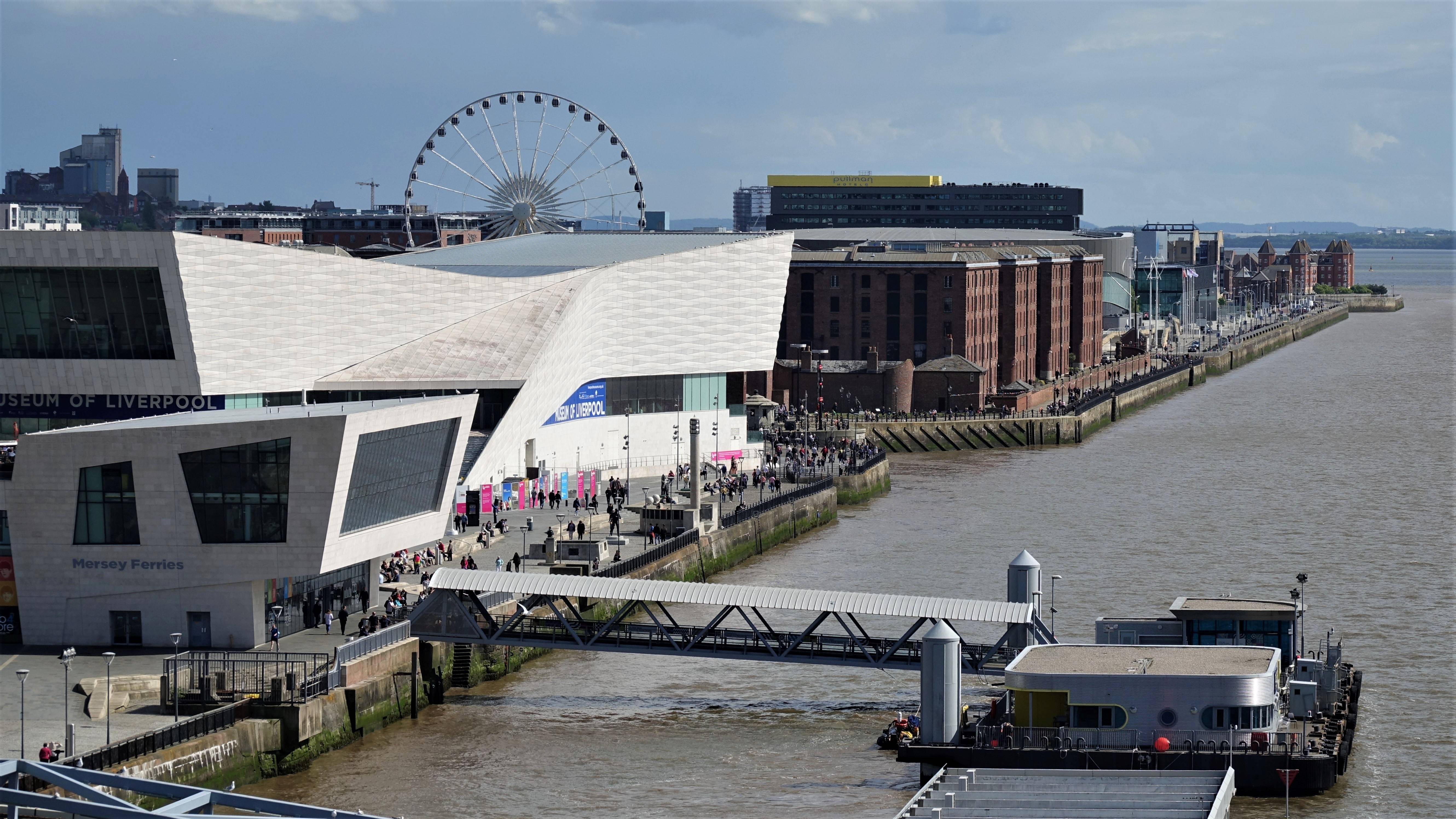 Wenn wir zu Flussseite schauen, sehen wir die weltbekannte und besungene Fähre über den Mersey River, der auch Namensgeber für den Sound der Stadt war: den Mersey-Beat, der sich aus den hier schon vertretenen Musikstile wie Rock ‚n‘ Roll, Blues, Jazz und Folk entwickelte und dessen Wiege im 1957 gegründeten „Cavern Club“ stand.