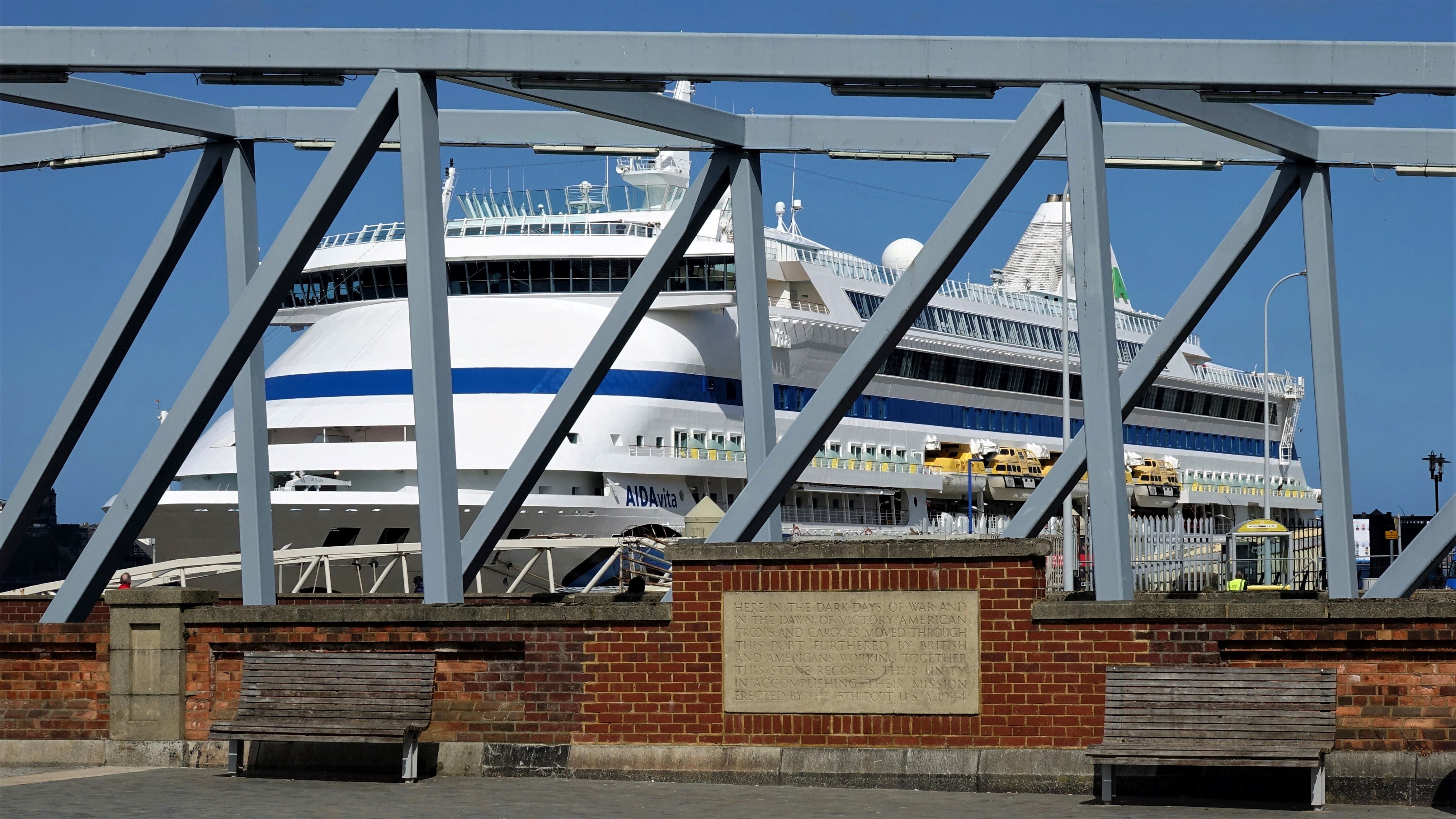 Gegen 10:00 Uhr verlassen wir zu viert unsere AIDAvita und werfen noch einmal einen Blick zurück. Auf einer Gedenktafel wird an die amerikanischen Truppen erinnert, die während des 2. Weltkrieges hier nach Europa kamen.