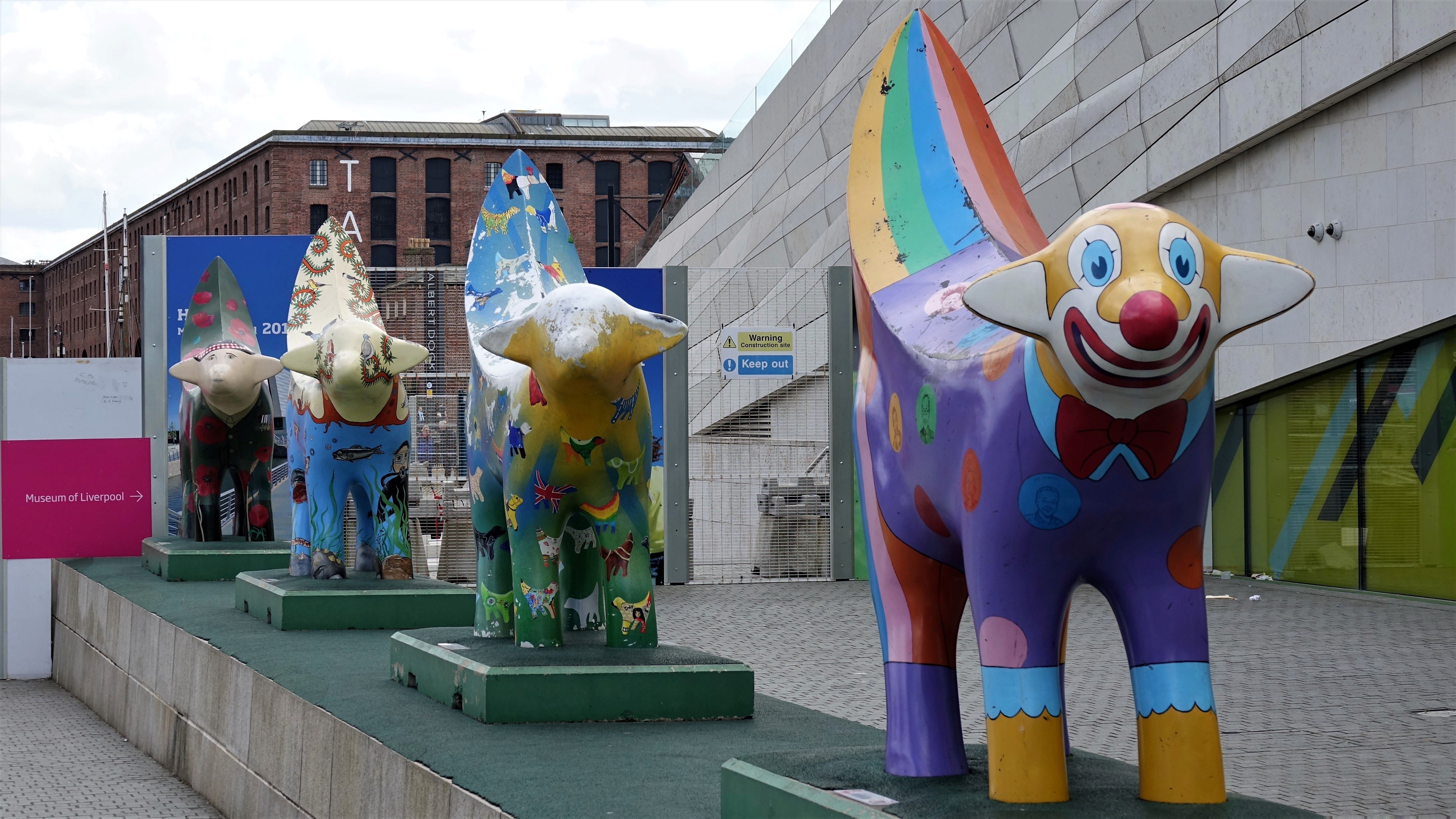 Dann erreichen wir das am 19.07.2011 eröffnete „Museum of Liverpool“. Das von dem dänischen Architekten Kim Herfoth Nielsen entworfene Gebäude hat 72 Millionen Pfund gekostet. Da uns heute die Zeit für einen Besuch fehlt, sehen wir uns nur außen ein wenig um. Hier finden wir weitere „Superlambananas“. Und eine schöne Perspektive auf die drei Grazien.
