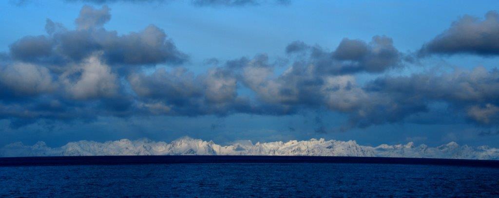 Die Ausläufer der südlichsten Haupt-Lofoteninsel Moskenesøy sahen wir in rd. 33 km Entfernung.