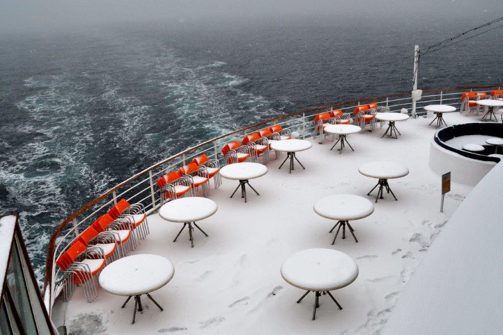 Ein Traum von einem Morgen auf dem Nordmeer. Es hatte nachts geschneit. Herrlich, wie beim ersten Rundgang auf Deck 11 der Schnee unter den Schuhen knirschte.