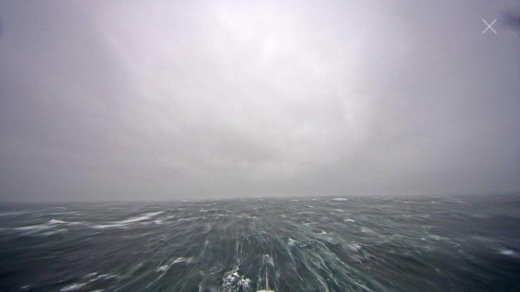 Bisher war das Geschaukel einigermaßen erträglich. Der nicht nachlassende Orkan zog es zunächst vor, uns von vorne zu beglücken. Aber dann … wurden die Seiten malträtiert … Ab und zu sorgten richtig harte Brecher, dass die AIDAcara Sätze zur Seit machte. Es krachte … auch im hintersten Bereich der Calypso-Bar. Dort, wo sich Hungrige mit den „Highlights der Schären“ erfreuen wollten. Bei einigen klappte es nicht so richtig. Eine Mega-Welle sorgte dafür, dass einige Passagiere von ihren Stühlen rutschten. Teller, Essen und Besteck hinterher. Auf dem Boden fand sich alles wieder … Ein Durcheinander, wie man uns berichtete. Zum Glück war niemand richtig zu Schaden gekommen … Das alles passierte gegen 18 Uhr. Die Bug-Webcam zeigte, was draußen los war …