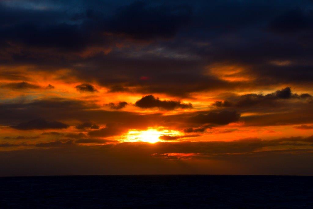 Um die Mittagszeit waren wir noch ein tüchtiges Stück von Trondheim entfernt. Das Wetter wechselte zwischen kurzem Sonnenschein und stärkster Bewölkung. Für uns kein Problem und wir blieben möglichst auf den Oberdecks. Die 22 km entfernte norwegische Küste war zeitweilig zu sehen. Nicht ganz klar – aber erkennbar. Unterbrochen von der Kaffeestunde trieben wir uns an der frischen Luft herum und drehten – gefangen vom uns umringenden Nordmeer – unsere Runden. Gesunder Kalorienabbau. Bis zur Ankündigung des Sonnenuntergangs – ihn gab´s endlich wieder.