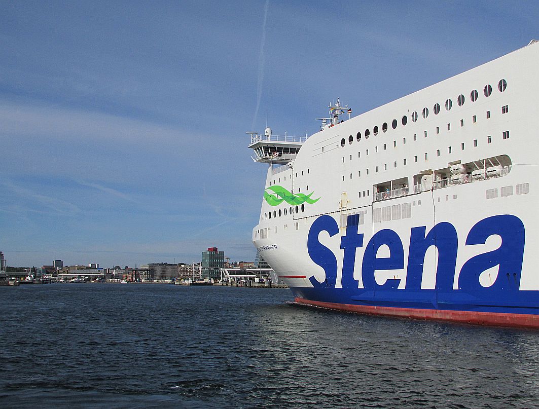 Die markante Silhouette von "Stena Line" glänzt silbern in der Morgensonne: