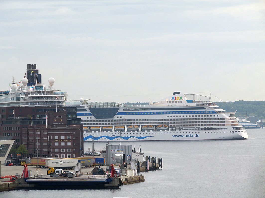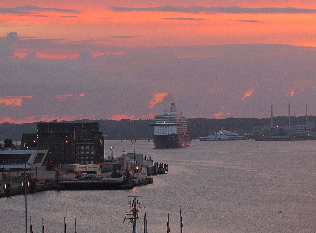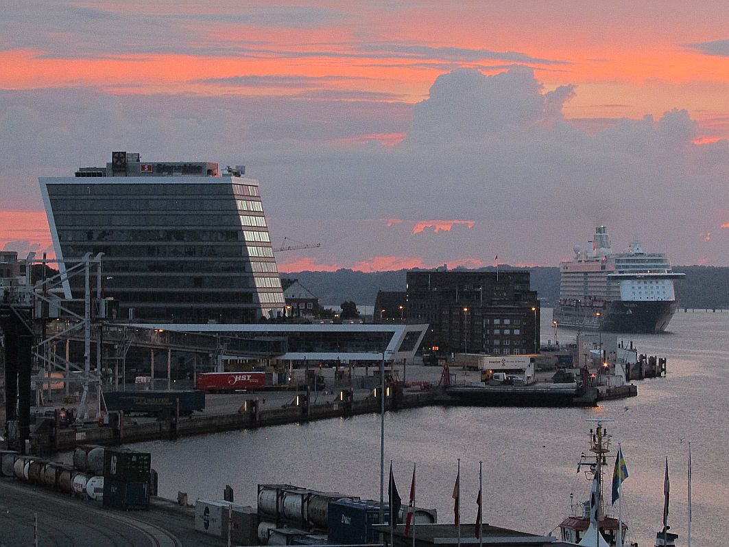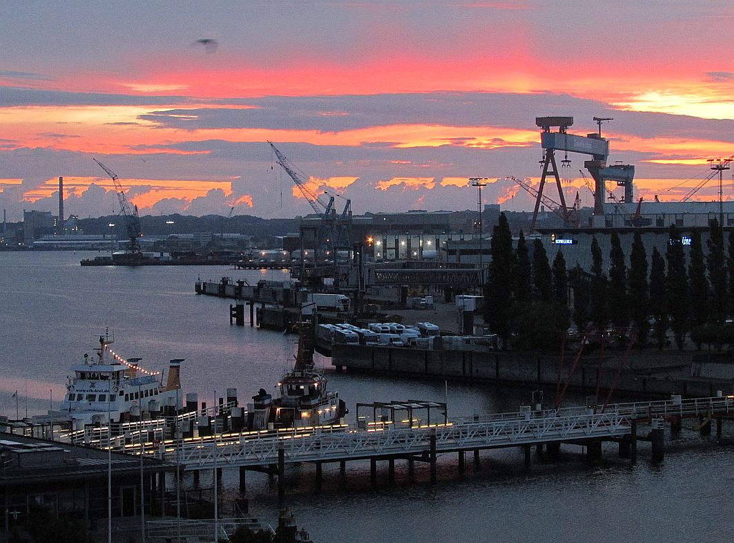Gut habe ich geschlafen. Fast ein bisschen wie in meinem AIDA-Bett. Doch etwas fehlt: der Blick aus dem Bett hinaus über den Balkon aufs weite Meer. Gut, das weite Meer würde ich jetzt, gegen 03:30 Uhr, ohnehin nicht sehen, denn noch ist es draußen dunkel. Ja, etwas fehlt. Doch etwas ist dafür noch geblieben - ein leichtes Schaukeln, das ich empfinde, während ich mich in meinem Bett aufsetze, um einen kurzen Blick auf das Lichtermeer entlang der Kieler Förde zu erhaschen. Nein, "landkrank" bin ich nicht. Und diese "Fata Morgana" des vom Organismus vorgetäuschten Schaukelns verschwindet garantiert im Laufe des Tages.