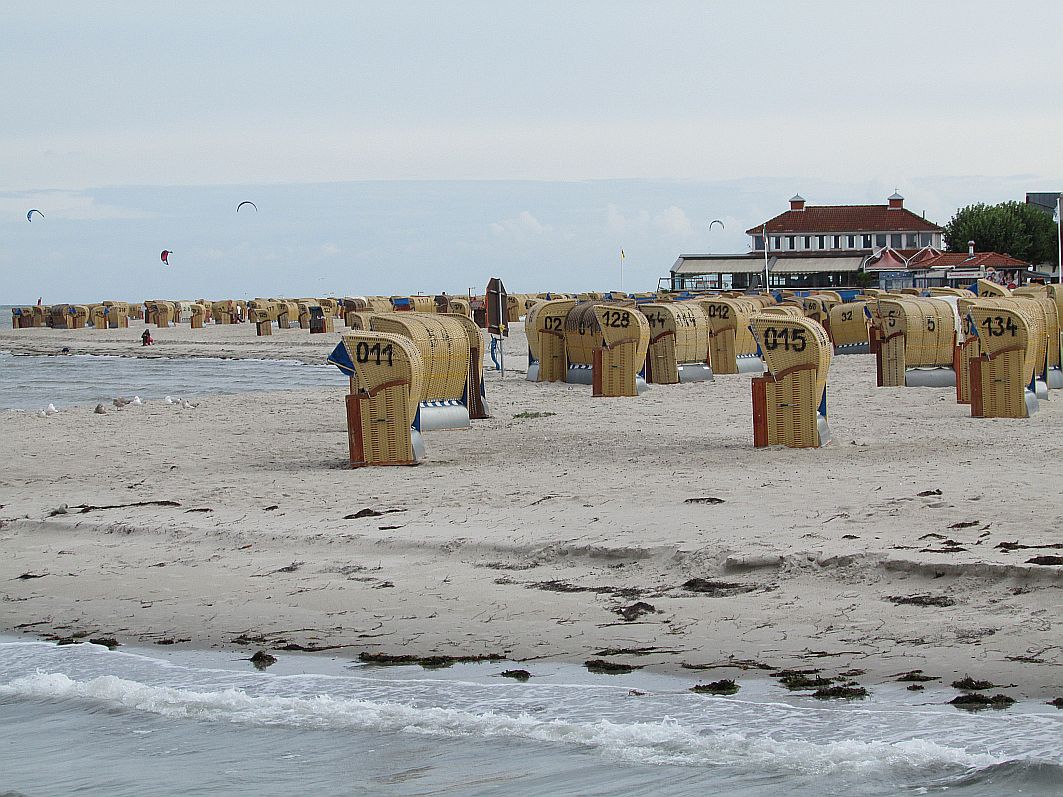 Da ich mich als zeitweiliger Gast an die Vorschriften halte, ziehe ich mir an einem der Automaten eine Strandkarte. Für 2,50 € und mit einem guten Gewissen betrete ich nunmehr in aller Ruhe den Kurstrand, an dem trotz des schönen Wetters noch relative Ruhe herrscht.