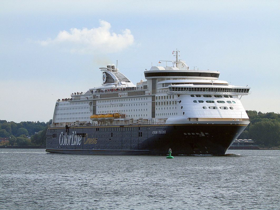 Majestätisch zieht "Color Fantasy" an unserem Schlepper vorbei in Richtung Norwegenkai und einmal mehr fühlt man sich wie ein Zwerg unter lauter Riesen.