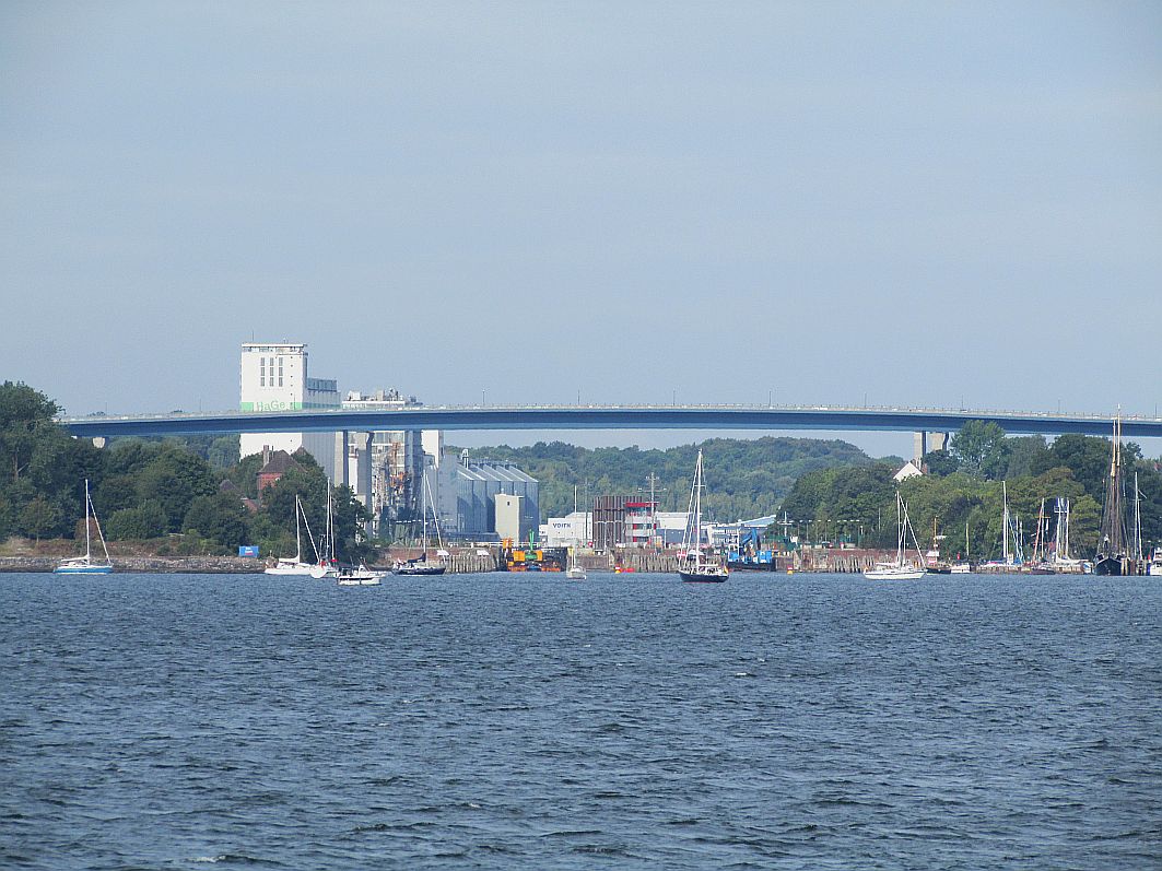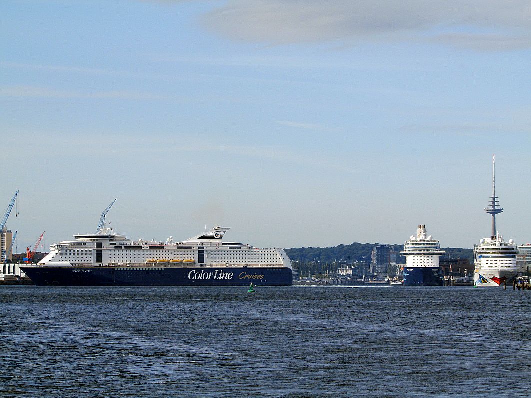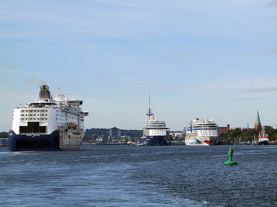 Je weiter wir uns von Schleswig-Holsteins Landeshauptstadt entfernen, umso kleiner werden auch die Schiffsriesen mit Kurs Kiel. Die schöne Norwegenfähre vollführt gerade ihre "Drehung auf dem Teller". Und AIDAbella hat eine ganz hohe Antenne bekommen. Na, ob sie damit heute Nacht unter der Brücke über den Großen Belt hindurchpasst?!