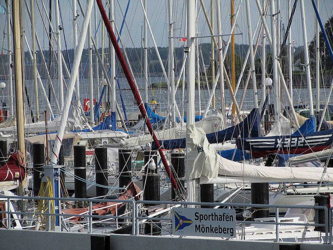 Wir nähern uns dem Anleger "Reventlou". Leicht schaukeln die schicken kleinen, in der Morgensonne schneeweiß leuchtenden Boote auf den Fährwellen auf und ab.