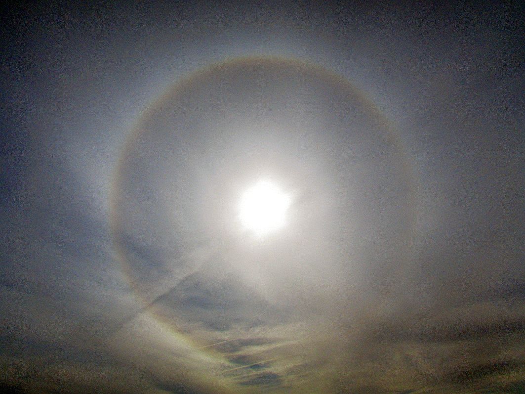 Dieser Lichteffekt entsteht durch Reflexionen und Spiegelungen an Eiskristallen in der Troposphäre. Eine Halo tritt meist in Cirruswolken auf, in welchen sich besonders viele Eiskristalle befinden - so wie heute augenscheinlich.