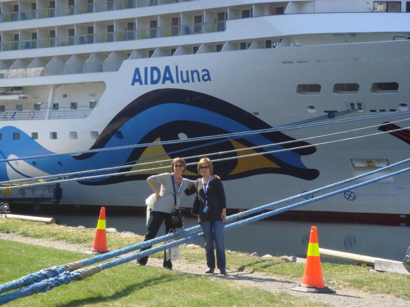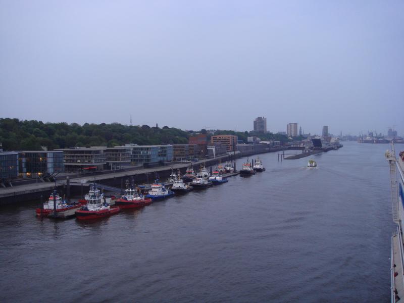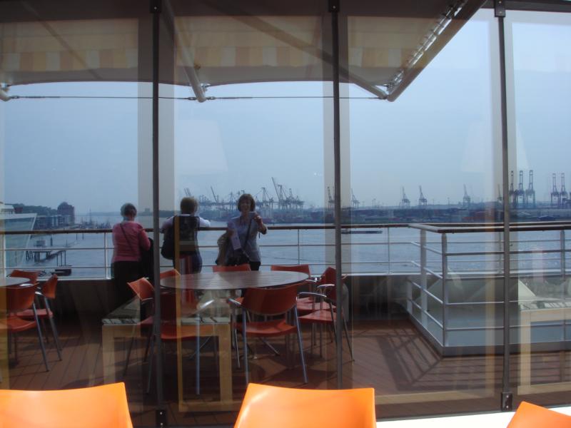 Nach dem Essen relaxten meine zwei in den gemütlichen Liegemuscheln am Theatrium und lauschten den Klängen der Live-Musik der Band Acoustic Avenue. Rausgehen wollten sie jetzt nicht mehr ... und so begab mich alleine aufs Deck, mein „Sail away“ hören und zu schauen, wie die Luna ablegt. Telefonierte mit meinem Mann und einer AIDA-Freundin, die per Webcam im Internet verfolgen konnte, wie die Luna sich im Hafen einmal um die eigene Achse drehte und langsam Hamburg in Richtung Nordsee verließ. Oh wie schön, was die Technik da alles vollbringt. Ich konnte meine Freude via Handy mit den Daheimgebliebenen teilen.