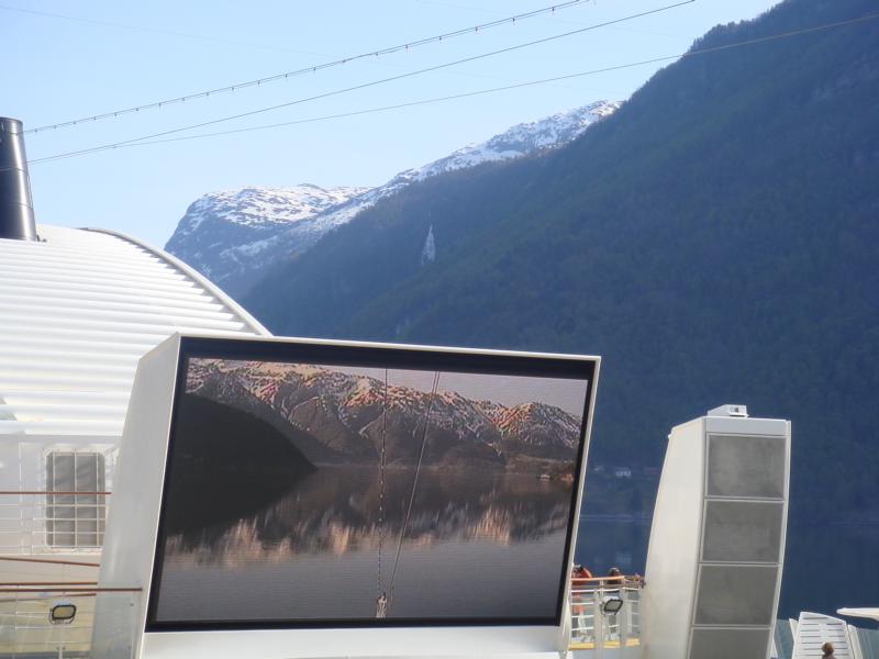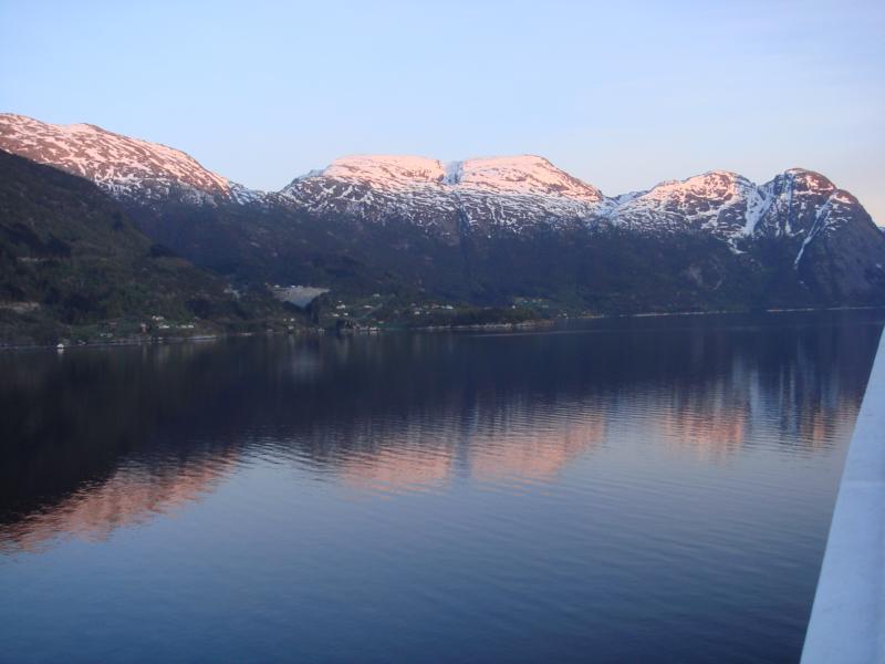Die Nacht war kurz für mich, 3.40 Uhr ich werde wach und schaue zum Fenster raus. Eine ganz leichte Dämmerung ist zu sehen. Leise schleiche ich mich auf dem Balkon und sehe direkt gegenüber die Schatten der schneebedeckten Berge. Rückwärts gesehen, kohlrabenschwarze Nacht noch und als ich in Richtung Bug blickte, sah ich am Horizont einen leicht rötlichen Schimmer, beginnende Morgenröte. Welch ein Erlebnis. Ich hörte nur das leise Rauschen des Wassers und eine unwirkliche Stille umgibt mich. Mutti schläft noch, ob sie wohl von der Hochzeit geträumt hat?