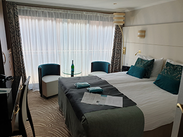 Bei der Einschiffung wurde Fieber gemessen, dann ging es zunächst aufs Sonnendeck. Wir erhielten ein Glas Wasser. Dann wurde zum Check in gerufen, das ging sehr schnell. Innerhalb einer Viertelstunde hatten alle ihre Kabinenkarten erhalten. Die Kabine (Kabine mit französischem Balkon auf dem Saturndeck) war sehr geräumig.