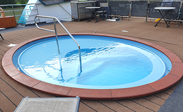 Da unsere Koffer noch nicht da waren, schauten wir uns nun zuerst mal das Schiff an. Es war sehr übersichtlich. Im Untergeschoss gab es neben den Kabinen einen Fitness-Raum, den man nach Anmeldung benutzen konnte. Auf unserer Etage gab es zusätzlich zu den Kabinen den Speisesaal, auf der oberen Etage war die Rezeption, die Kreuzfahrtleitung, ein kleiner Shop und die Lounge. Auf dem Sonnendeck gab es einen kleinen Pool (Whirl-Pool-Größe),