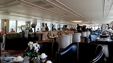 Das Auslaufen startete mit toller Auslaufmusik pünktlich um 15.30 Uhr. Um 16.00 Uhr gab es Kaffee und Kuchen, um 17.00 Uhr waren wir auf einen Willkommens-Sekt in die Lounge eingeladen.