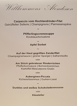 Das Abendessen fand (jeden Abend) um 19.00 Uhr statt. Man hatte einen zugewiesenen Tisch. Wir saßen zu viert an einem 6er-Tisch, jeweils neben uns war ein Platz frei. Das Essen wurde in mehreren Gängen serviert und war jeden Tag fantastisch. Man konnte zwischen 2 oder 3 Vor-, Zwischen-, Haupt- und Nachspeisen wählen.
