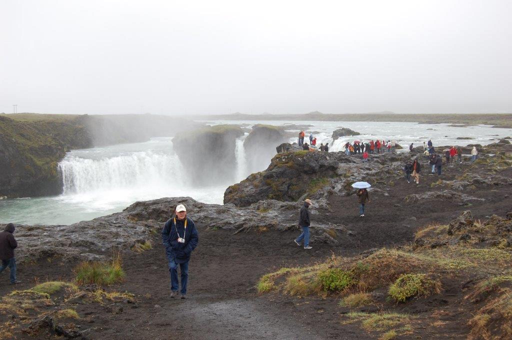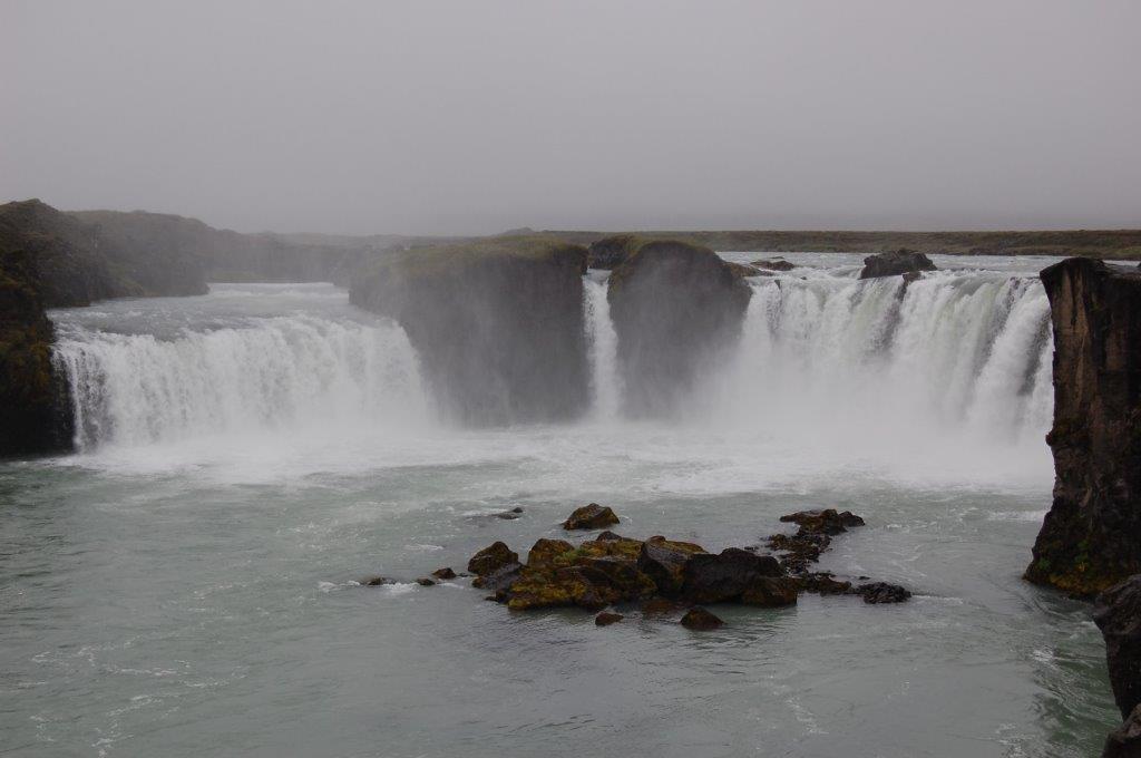 Das nordisländische Wetter war am 11. August im Gegensatz zu den vergangenen Tagen nicht allzu gut: leichte Regenschauer und Dunst. Dennoch ging es mit großen Erwartungen und Vorfreude in den Tagesausflug „Goðafoss & Mývatn“. Von der als Hauptstadt des Nordens bezeichnete und mit ca. 16.000 Einwohnern außerhalb des Großraums Reykjavik größte Stadt Islands fuhren wir auf der Ringstraße 1, die küstennah ganz Island „umrundet“, am Eyjafjörður entlang zum Wasserfall Goðafoss.