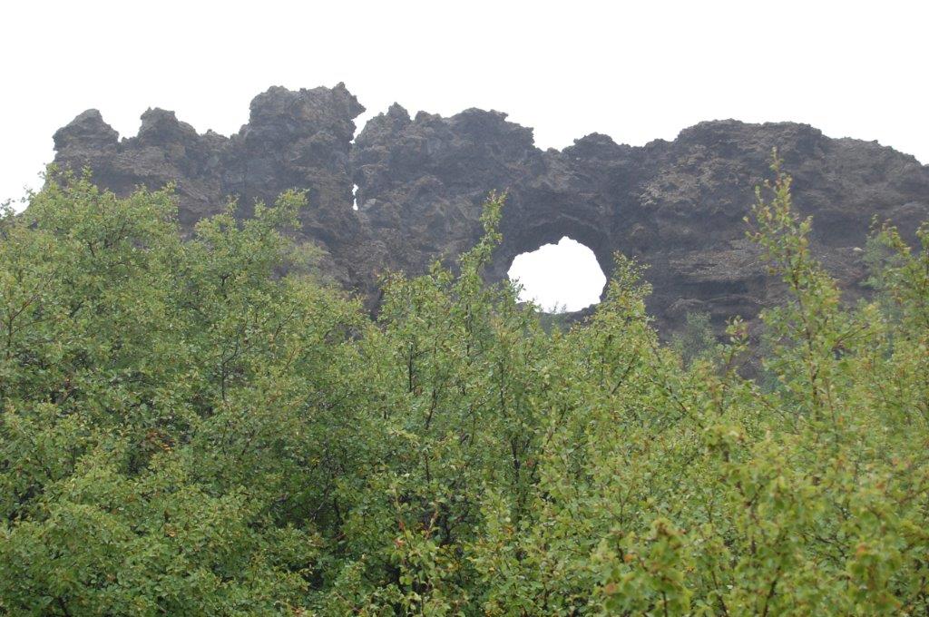Sie entstand vor 2.300 Jahren, als sich ein 20 m dicker Lavasee aufstaute. Die heiße Lava brachte das Grundwasser zum Verdampfen, der nach oben steigende Dampf zerriss die Lava und ließ sie erstarren. Dadurch bildete sich auf einer Fläche von 1 km² die heute noch sichtbaren Lavagebilde, nämlich Türme, Kanäle, Überhänge, Höhlen, Brücken … Dimmuborgir bedeutet „dunkle Burgen“. In dieser versteinerten Stadt sollen Trolle hausen. Wenn man sich diese bizarren braun-schwarzen Lavaformen anschaut, kann man sogar fast daran glauben …