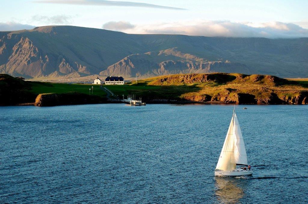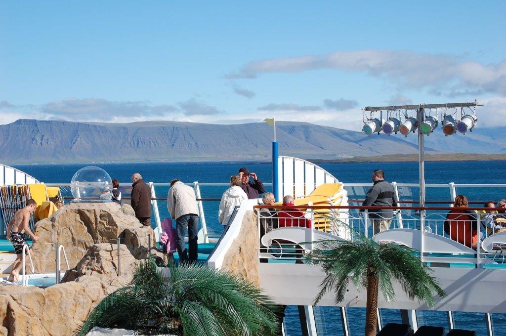 Frühmorgens schien die Sonne durchs unser Kabinenfenster – doch Land war noch nicht in Sicht. Nach wie immer ausgiebigem Frühstück nutzten wir die Zeit auf See, uns noch ein wenig mehr Urlaubsbräune anzueignen, bis wir am späten Vormittag eine Landzunge mit dem Bergrücken Snæfellsness und dem 1.446 m hohen Gletscher Snæfellsjökull erreichten. Durch die Bucht Faxaflói liefen wir mittags Reykjavík bei zunächst leichtem Dunst - aber bei Sonnenschein - an.