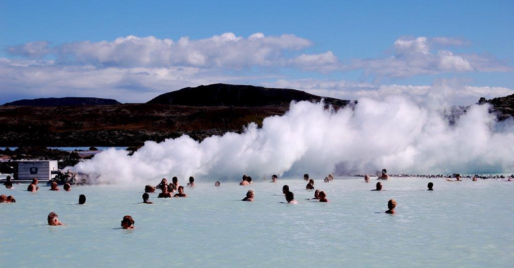 Dann passierten wir nach nicht allzu langer Zeit schroffe Lavafelder, in denen die Blaue Lagune liegt. Dort fördert das Kraftwerk Svartsengi aus 2 km Tiefe mineralhaltiges, 240 Grad heißes Wasser zum Beheizen der umliegenden Ortschaften, des Flughafens Keflavik sowie zur Stromerzeugung aus Wasserdampf. Das noch 70 Grad heiße (Rest-)Wasser sammelt sich in der Blauen Lagune und ist angereichert mit das Wasser graublau färbender Kieselerde, Salz und Algen. Dieses Wasser sowie die schlammigen Ablagerungen bieten Hautkranken - insbes. bei der Schuppenflechte - heilende Wirkung, so dass die Blaue Lagune den Ruf eines Heilbades genießt.