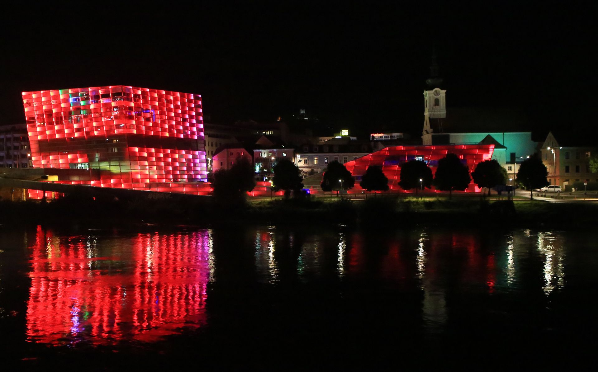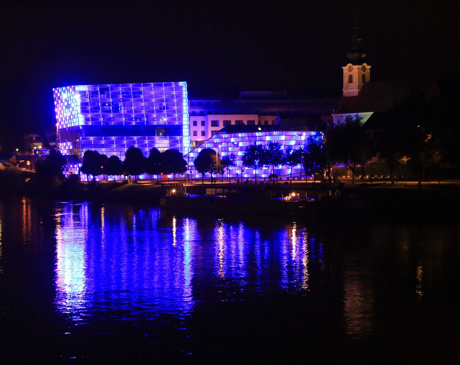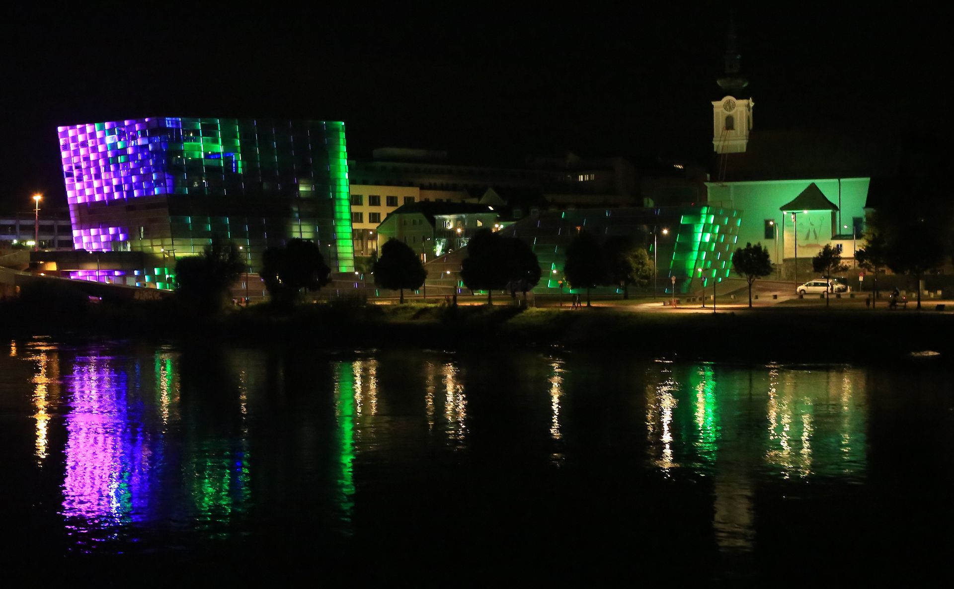 Nach dem letzten tollen Abendessen kamen wir erneut an Linz vorbei. Linz im Dunklen ist wirklich sehenswert, da die Nibelungenbrücke sowie das Lentos Kunstmuseum schön beleuchtet sind und das Ars Electrica-Center auf der Gegenseite in unterschiedlichen Farben illuminiert wird.