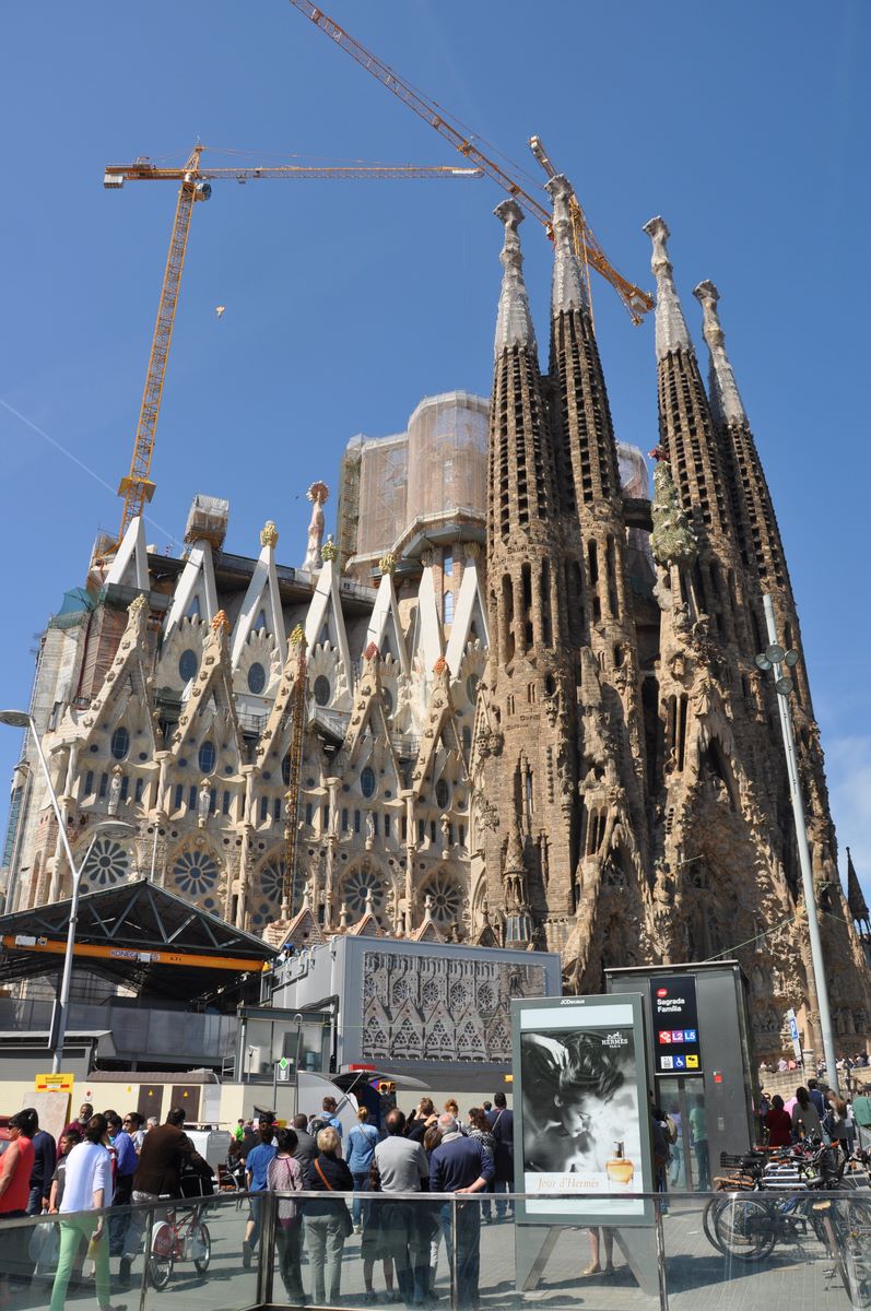Mit der U-Bahn geht es weiter zur Sagrada Familia. Leider haben wir von zu Hause aus keine Tickets reserviert, denn die Schlange am Eingang ist mal so richtig lang. So entscheiden wir uns gegen einen spontanen Besuch. Wir hoffen, Antoni Gaudi, dessen innovative Architektur die Basilika bis heute prägt, wird es uns verzeihen. Unsere "Jungen" tun es auf jeden Fall. Ich meine ein leichtes Aufatmen zu hören, als wir beschließen, diese seit rund 160 Jahren dauernde "Baustelle" nur von außen zu umrunden.