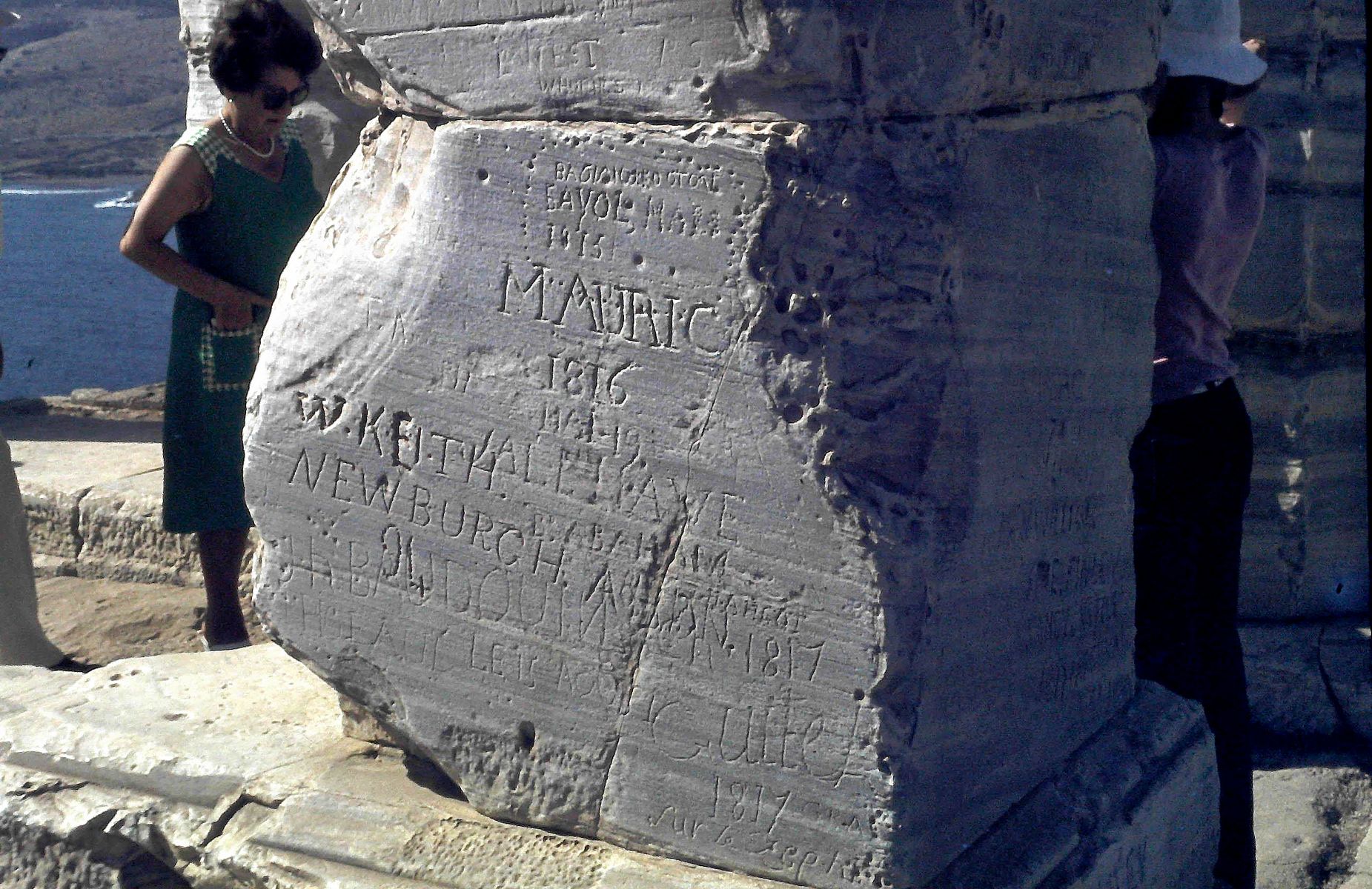 So, wie üblich raus aus dem Bus und hinauf gestiefelt zum einstigen Heiligtum. Es war frei begehbar und ich ließ mich nicht davon abhalten, den Tempel so genau wie möglich zu begutachten. Einfach nur schön und auch elegant, was die alten Griechen damals geschaffen hatten. Und auch luftig – wir genossen es, unter der sengenden Sonne den leichten Wind um unsere Nasen streichen zu lassen. Einen Nachteil hatte es, dass man sich – wie seit nunmehr vielen Jahren aus gutem Grund nicht mehr – auf der Anlage frei bewegen konnte. An den Tempelresten übten sich die Vorgänger der heutigen Graffiti-Sprayer.