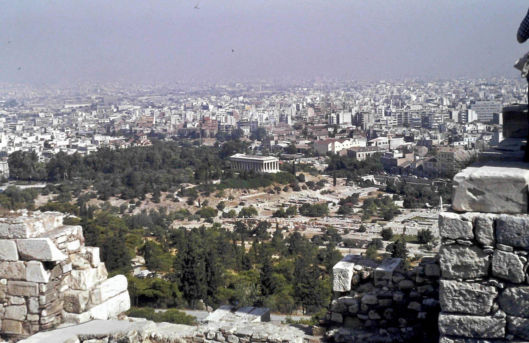 Oh, oh, wir wurden vollgestopft mit Wissen. Über das, was sich vor Jahrtausenden die Hellenen geleistet hatten. Aber es reichte noch nicht. Von ganz oben hatten wir auch prima Ausblicke auf die Stadt Athen. Und was sahen wir auf einmal? Endlich wieder einen Tempel. Den des Hephaistos, der als besterhaltener Tempel Griechenlands gilt.