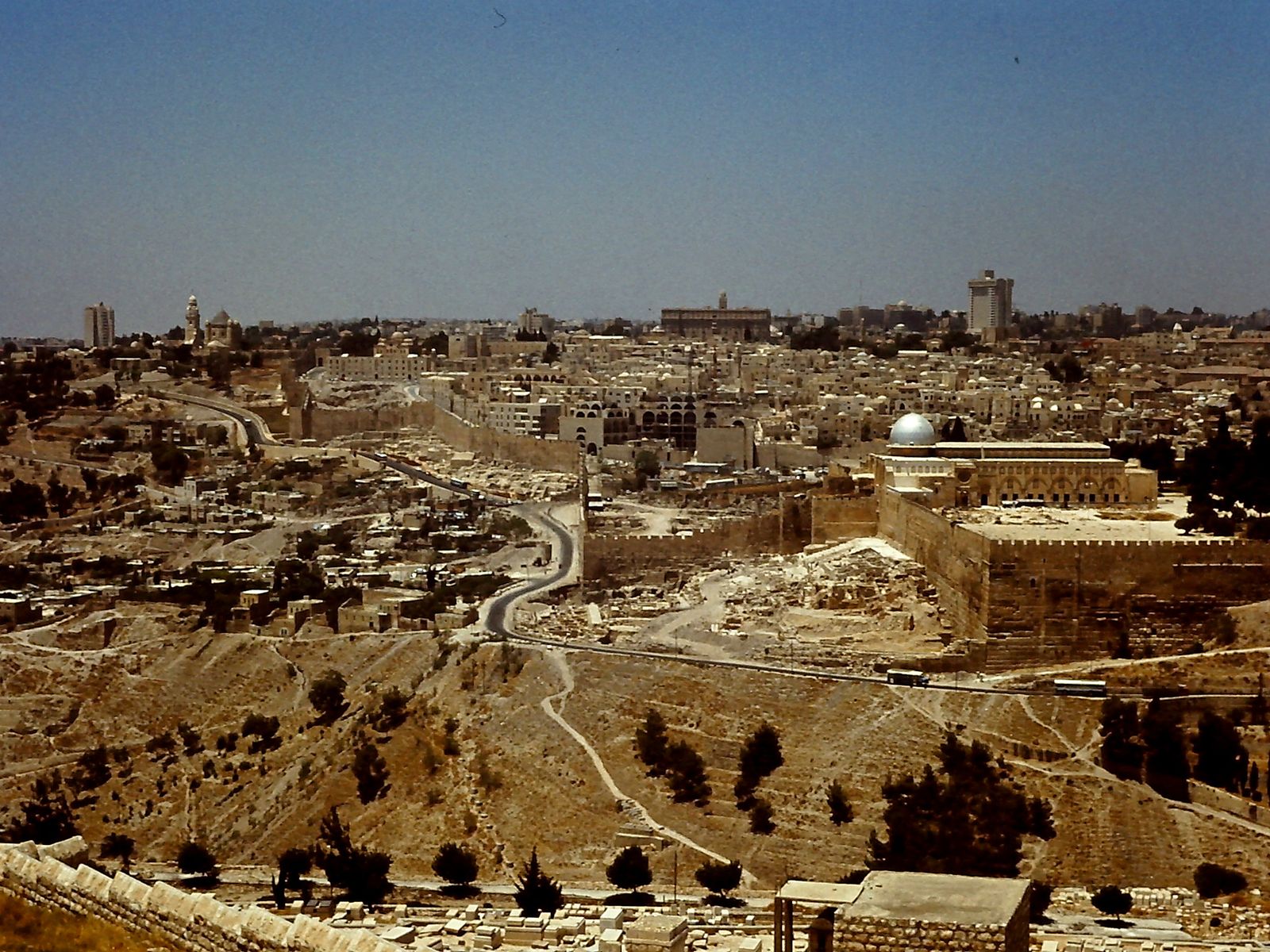 Im Hintergrund Jerusalem, davor die die Altstadt umgürtende Stadtmauer. Direkt im Anschluss umfassende Gräberfelder, die sich auch auf dem ansteigenden Ölberg fortsetzten. Rechts die Kirche Dominus flevit (Der Herr weinte). Was hat es mit den seit Jahrhunderten, nein, teilweise seit Jahrtausenden unveränderte gebliebenen Gräberfeldern auf sich? Lt. jüdischer Lehre soll der Messias vom Ölberg nach Jerusalem einziehen und im Kidrontal zwischen Tempel- und Ölberg Gericht halten. Zunächst soll über die gerichtet werden, die dort in seiner unmittelbaren Nähe begraben waren. Sie hatten die erste Chance der Auferstehung – aus diesem Grunde waren schon in biblischen Zeiten (und davor) die Grabstätten nahe der Stadtmauer sehr begehrt.