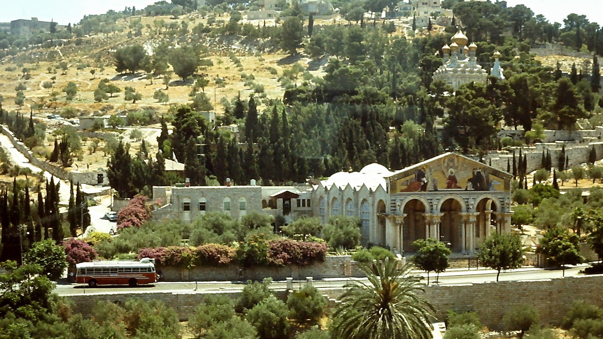 Endlich kamen wir in Jerusalem an. Unser Bus steuerte zunächst den Ölberg an. Wir passierten den Garten Gethsemane am Fuße des Ölbergs mit der Kirche aller Nationen;