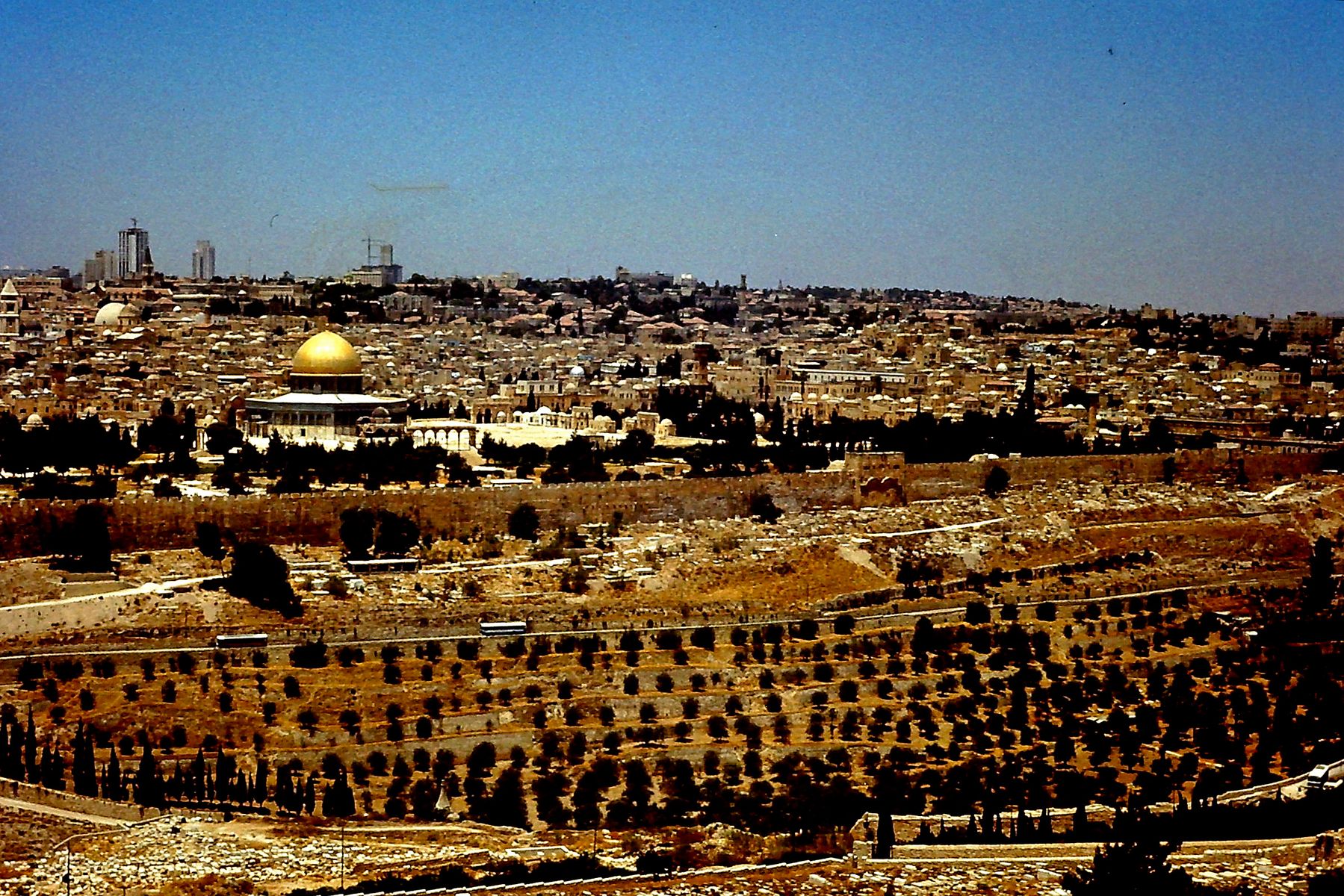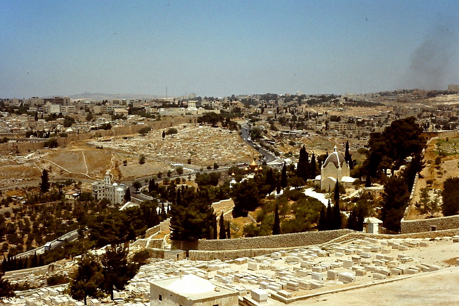 Im Hintergrund Jerusalem, davor die die Altstadt umgürtende Stadtmauer. Direkt im Anschluss umfassende Gräberfelder, die sich auch auf dem ansteigenden Ölberg fortsetzten. Rechts die Kirche Dominus flevit (Der Herr weinte). Was hat es mit den seit Jahrhunderten, nein, teilweise seit Jahrtausenden unveränderte gebliebenen Gräberfeldern auf sich? Lt. jüdischer Lehre soll der Messias vom Ölberg nach Jerusalem einziehen und im Kidrontal zwischen Tempel- und Ölberg Gericht halten. Zunächst soll über die gerichtet werden, die dort in seiner unmittelbaren Nähe begraben waren. Sie hatten die erste Chance der Auferstehung – aus diesem Grunde waren schon in biblischen Zeiten (und davor) die Grabstätten nahe der Stadtmauer sehr begehrt.