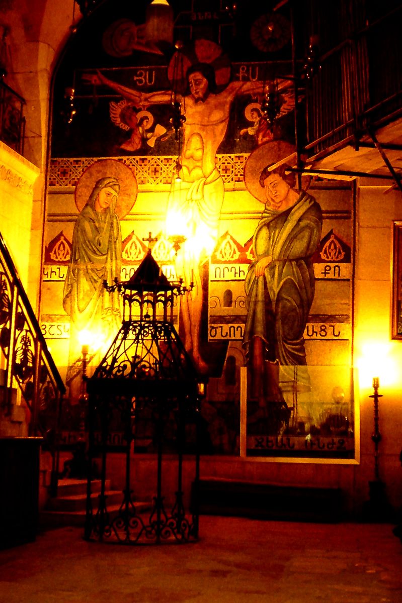 Das Innere der Kirche blendete durch Pracht. Ikonostasen, Gemälde, Mosaike, Altäre, … Und (entschuldigt bitte!): Es war der Teufel los! Das Durcheinander in der Via Dolorosa war nichts gegen das Geknubbel in den verschiedenen „Abteilungen“ des Gotteshauses. „Echte“ Gläubige fühlten sich in ihrer Besinnung mit Sicherheit durch ein an- und abschwellendes Stimmengewirr gestört. Vielleicht auch von den vielen Mönchen verschiedener Konfessionen, die zur Ehre Gottes (?) Besucher erleichterten. Ich kann mich noch daran erinnern, dass sie nichts von den israelischen Pfunden hielten – sie wollten Dollars …