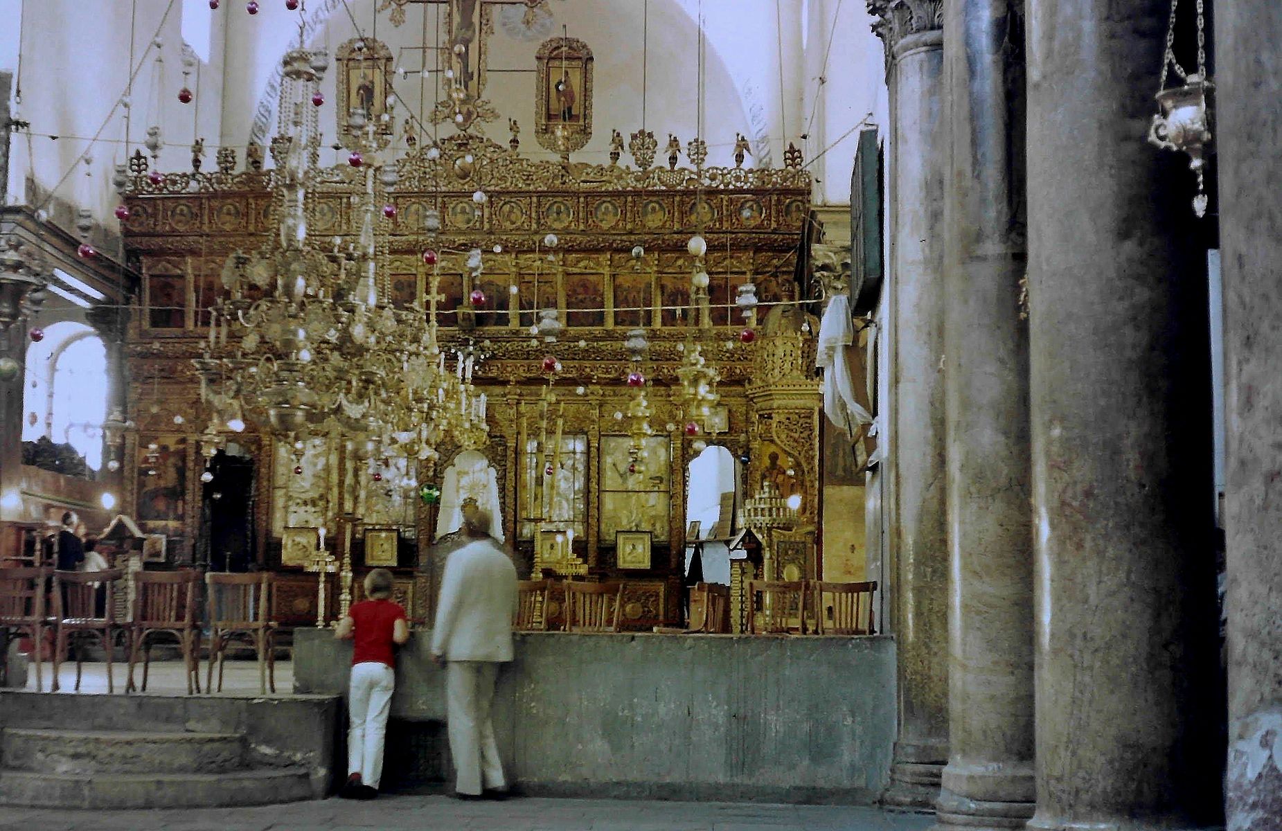 So, wir waren im Innenraum. Alles strebte zur engen Geburtsgrotte, an dem der Heiland geboren wurde. Ein vierzehnzackiger silberner Stern kennzeichnete den Geburtsplatz. Viel Zeit zum Informieren oder auch zum Gebet blieb nicht, denn man wurde im nicht nachlassenden Besucherstrom vorwärts gedrängt. In den anderen Teilen der Kirche war entsprechend mehr Platz. So vor der Ikonostase.