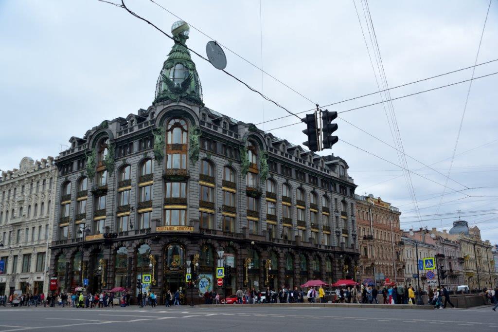 Das Singer-Haus, das Anfang des 20. Jahrhunderts im Auftrag des amerikanischen Nähmaschinen-Moguls Singer hochgezogen wurde. Lange hatte Singer nichts von diesem Meisterwerk – 1922 wurde es enteignet. Seitdem residieren im Erdgeschoss - auch heute noch – eine Buchhandlung und in den Obergeschossen diverse Buchverlage. Aktuell ist in diesem Haus vk.com untergebracht, ein Pendant von facebook. Nicht nur die Kuppel aus Glas und Stahl mit einem gläsernen Globus mit 280 cm Durchmesser machen das Gebäude zum Blickfang. Auch die klassizistischen Skulpturen waren Schuld daran, dass wir unser Gegenüber ein wenig länger bewunderten.