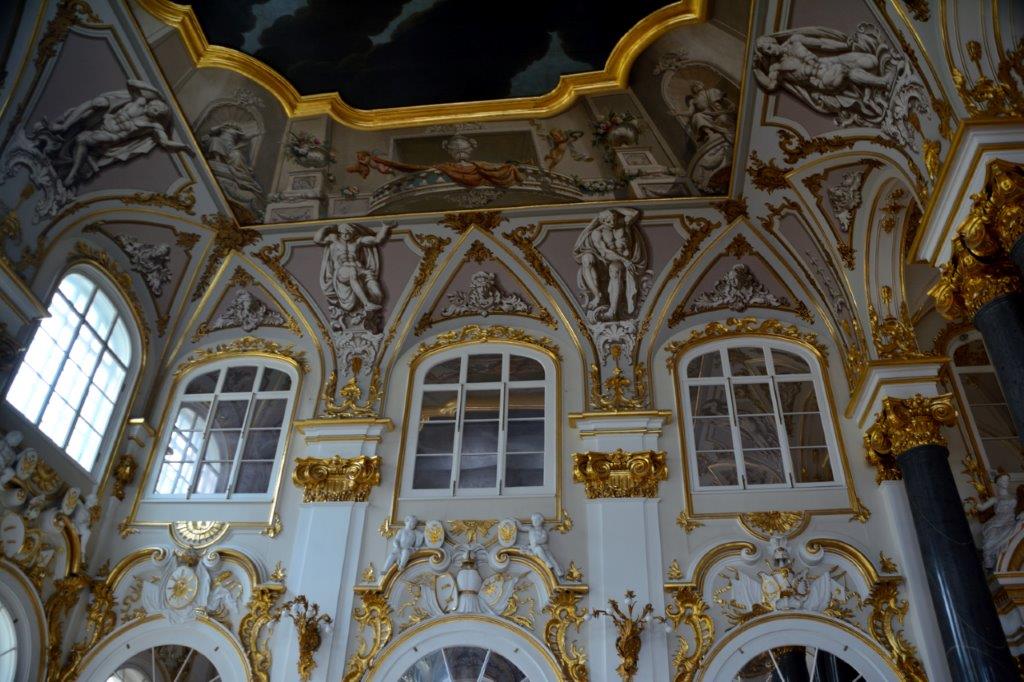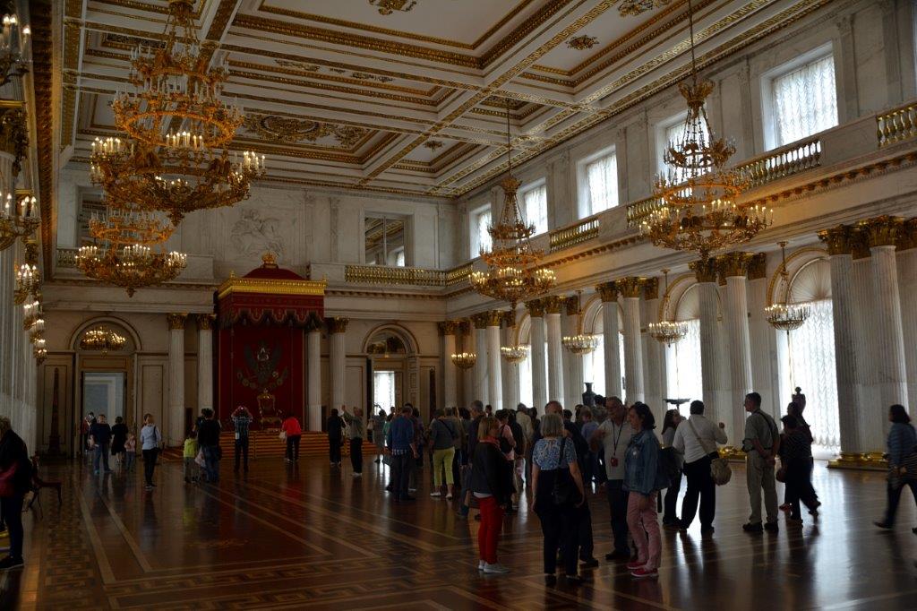 Wenn man mich zu diesem Zeitpunkt gefragt hätte, wo wir uns befanden, wäre meine präzise Antwort gewesen: im Winterpalast! Doch nun, beim Nacharbeiten, erkannte ich: Wir waren auch im kleinen Thronsaal, auch Peters-Saal genannt, zu dessen Ehren dieses bescheidene Refugium 1833 entwickelt wurde. Leuchtend roter, mit Silberfäden durchwirkter Samt an den Wänden – man gönnte sich ja sonst nichts … Das nächste 800 m² kleine Zimmer wartete auf uns – der Wappensaal. Bis zu 3.000 Personen gaben sich jede Mühe, den Parkettfußboden beim Schwofen durch Schlurfen zu beschädigen. Gut, dass er vor einigen Jahren erneuert wurde! Nicht nur an diesem Tag lösten wurden die Schwofenden von noch mehr Touristen abgelöst. Sieht man Wappen an den Wänden? Nein? Richtig – an den Kronleuchtern befanden sich alle Wappen der russischen Provinzen. Und an den Seiten komische Gebilde.