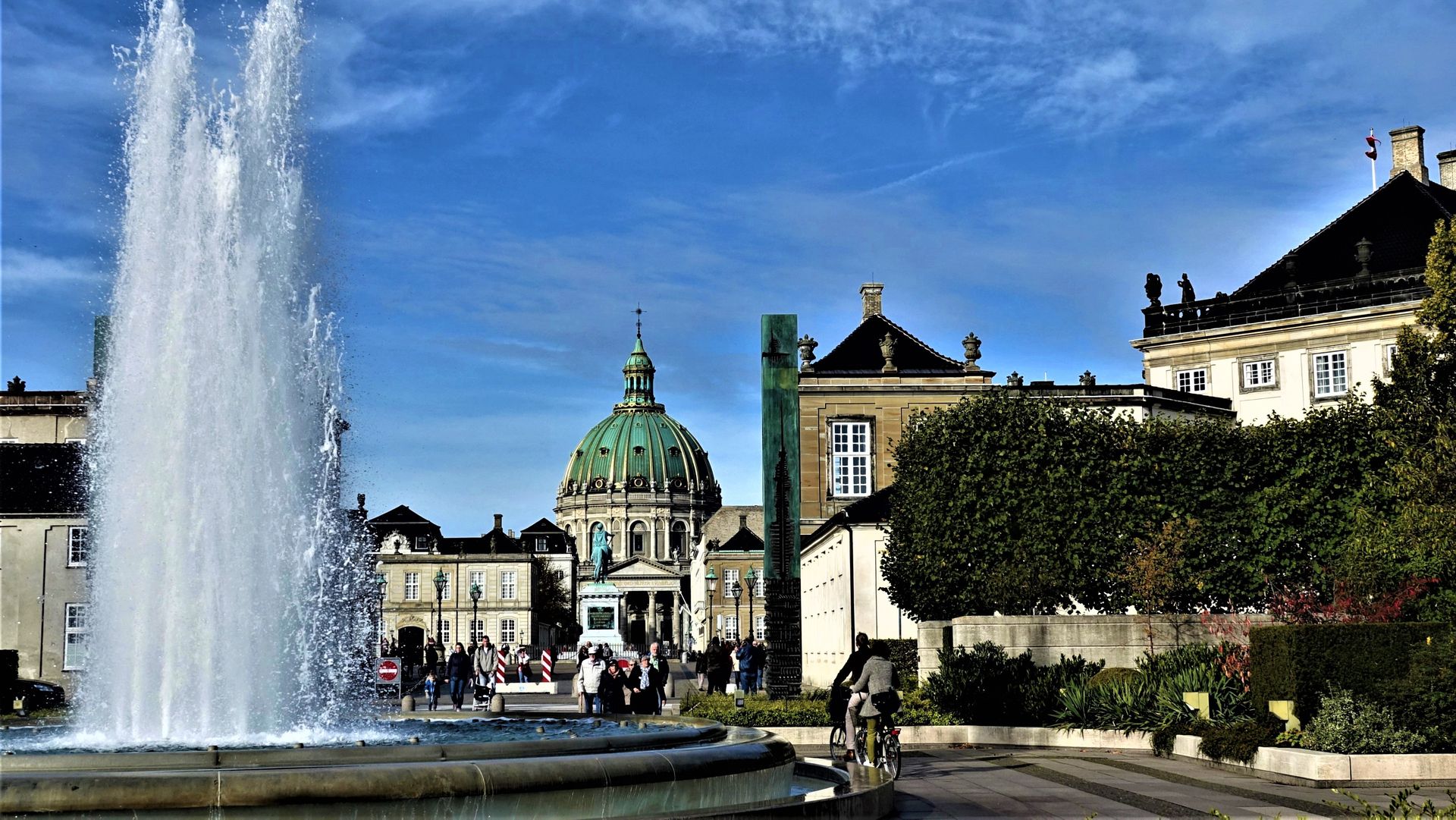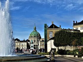 Ein Stück weiter des Weges können wir einen Blick auf das Schloss „Amalienborg“, das in den 1750er Jahren stammt und zunächst wurden die vier fast identischen Palais von vier adeligen Familien bewohnt. Nach einem schweren Schlossbrand in „Christiansborg“ erwarb die obdachlose Königsfamilie 1794 und in den folgenden Jahren die Gebäude. Heute residiert Königin „Margrethe II.“ im Palais Schack. „Vulkankönigin“ lautet der Spitzname der kettenrauchenden Monarchin. Die Familie des Kronprinzen bewohnt das Palais Brockdorff. Das Palais Moltke dient als Gästewohnungen und das Palais Levetzau beherbergt das Museum. Am Ende der Sichtachse über das Reiterstandbild „Frederiks V.“ sehen wir die „Frederiks Kirke“, die aufgrund kostbarer Baumaterialien auch „Marmorkirken“genannt wird. Nach einer Bauzeit von „nur“ 145 Jahren wurde sie 1894 eröffnet. Da waren wir in Hamburg mit der „Elphi“ ja richtig schnell.