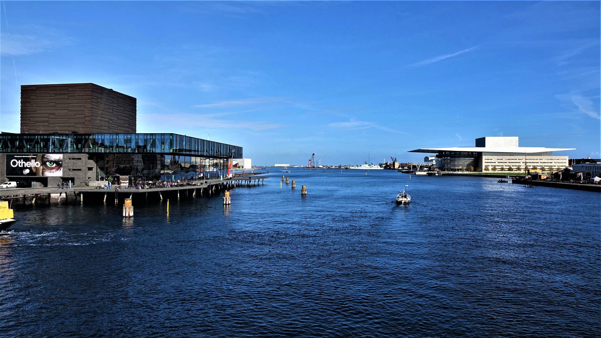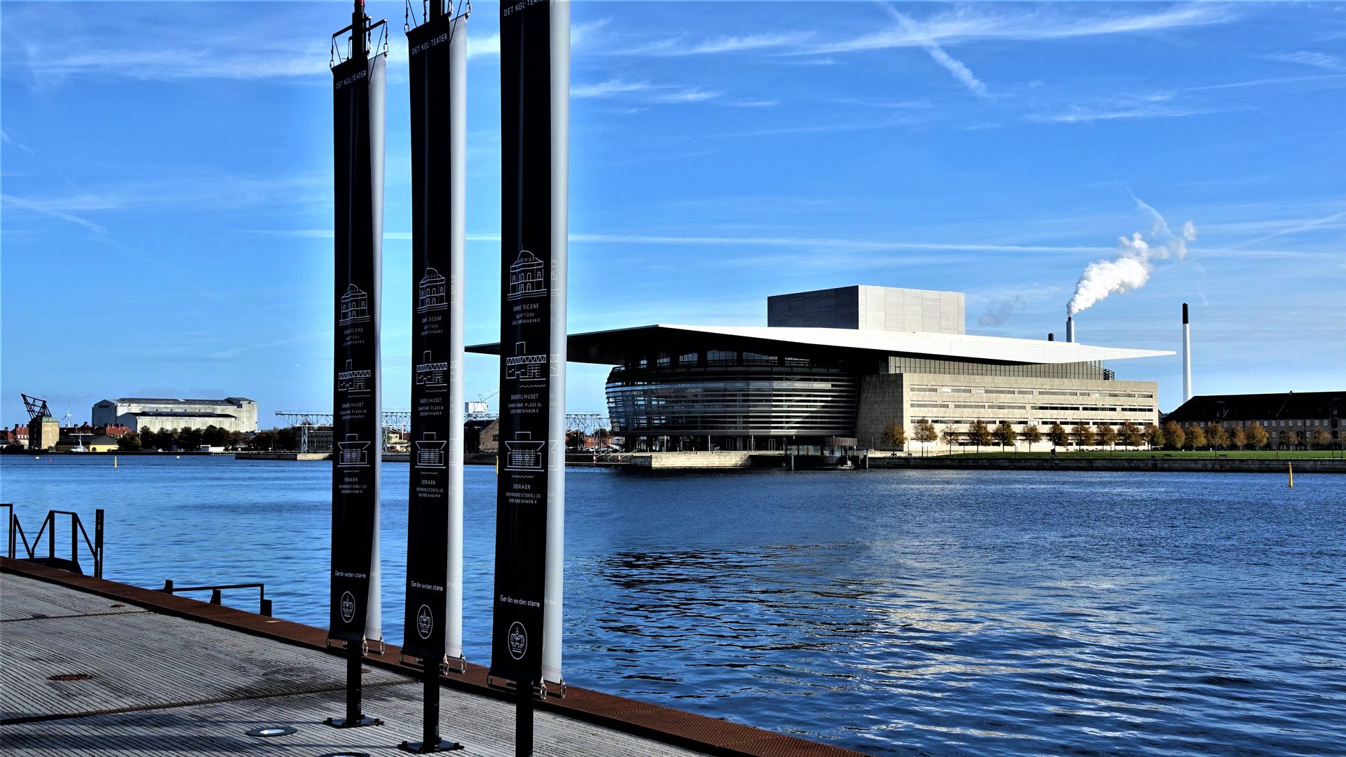 Von der ausladenden Holzterrasse des Schauspielhauses blicken wir schräg hinüber zu der Insel Holmen mit der 2005 eröffneten Oper. Das Gebäude wurde dem dänischen Staat von dem Großreeder Arnold Mærsk Mc-Kinney Møller geschenkt.