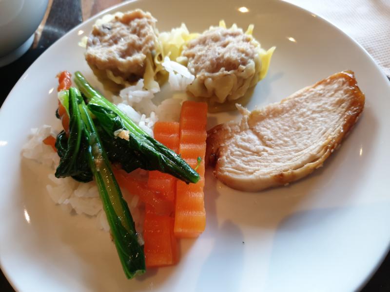 fällt deftig aus. Ich esse etwas Fleisch, Gemüse, Teigtaschen, Reis